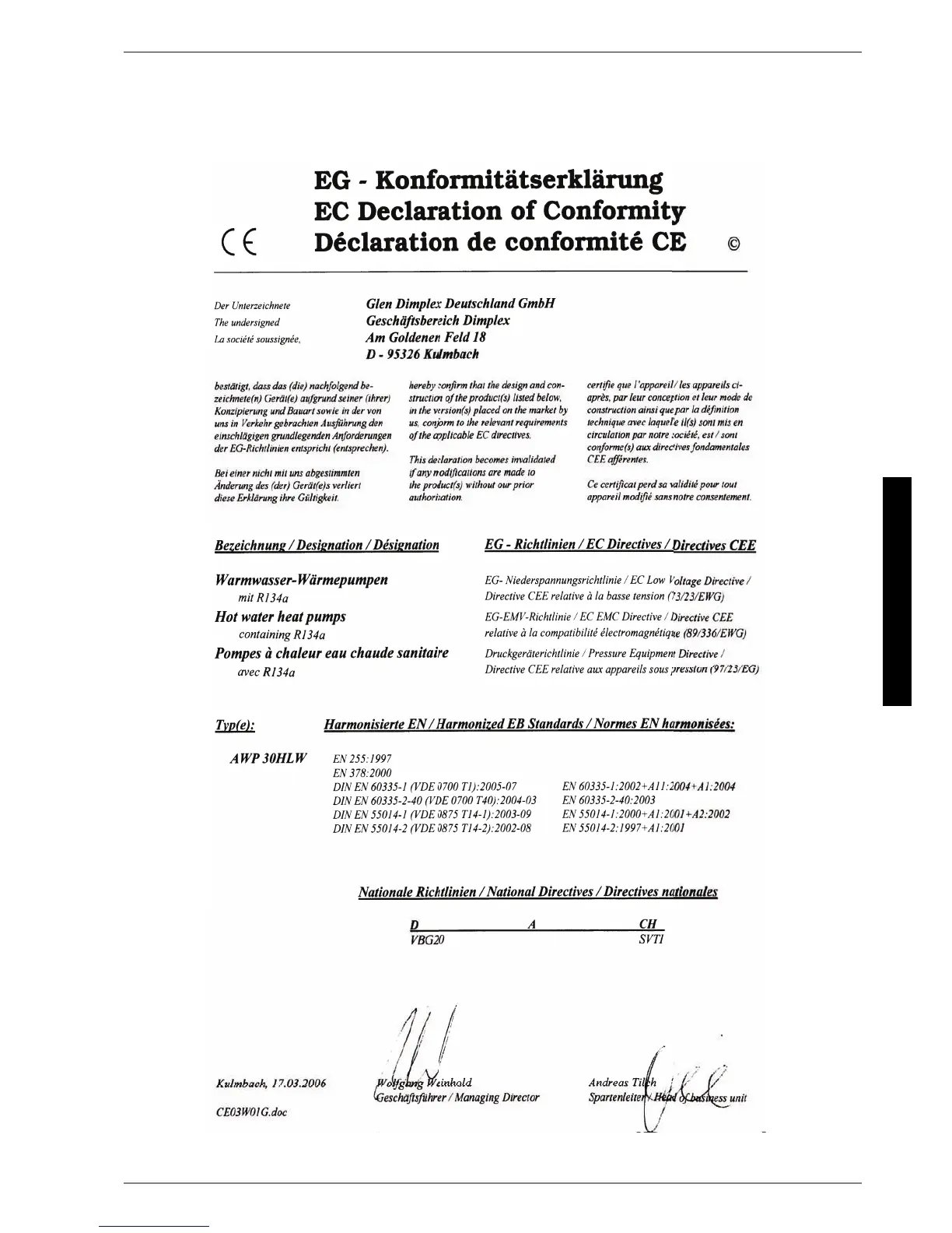 Dimplex AWP 30 HLW - 3 Konformitätserklärung; Declaration of Conformity; Déclaration de Conformité