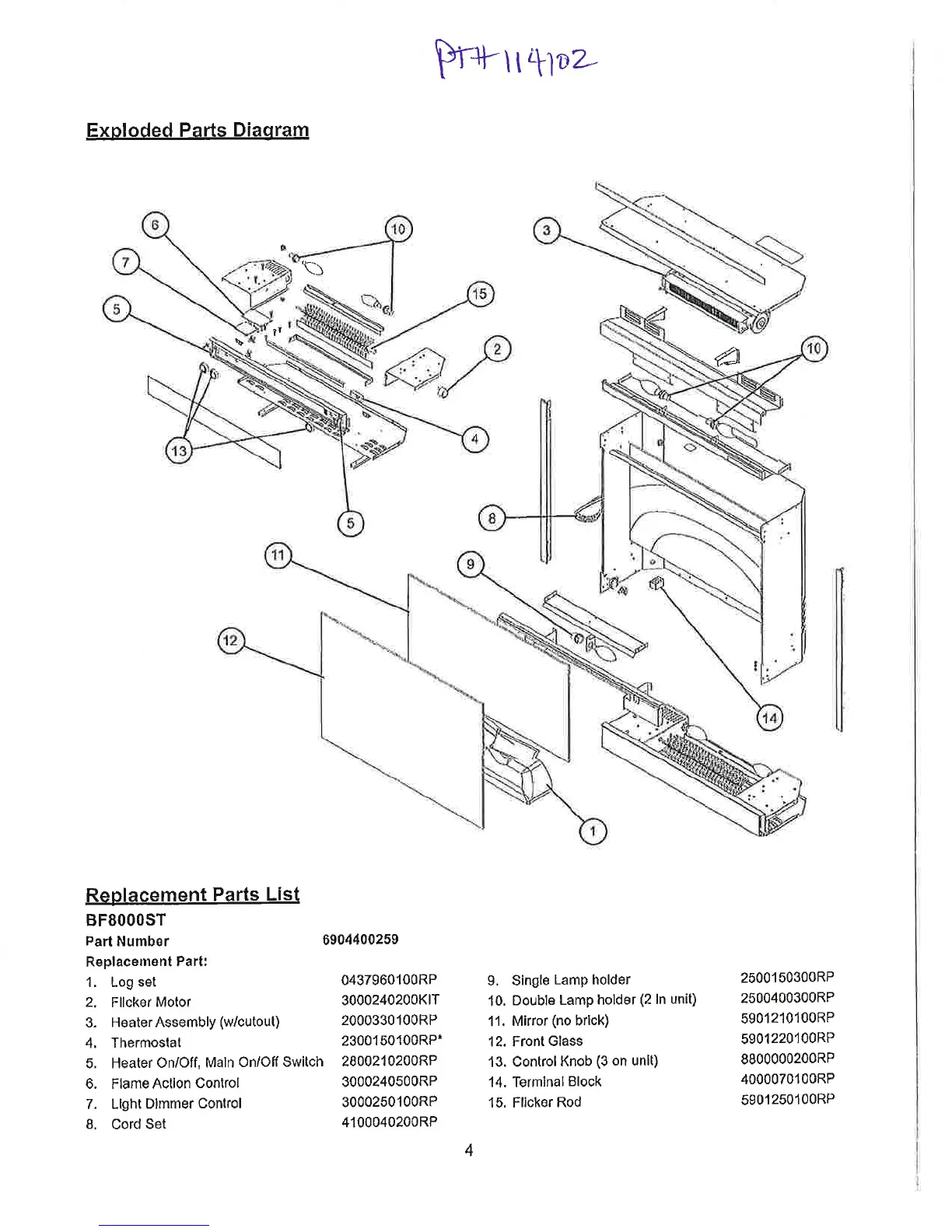 Dimplex BF8000ST - Exploded Parts Diagram; Replacement Parts List