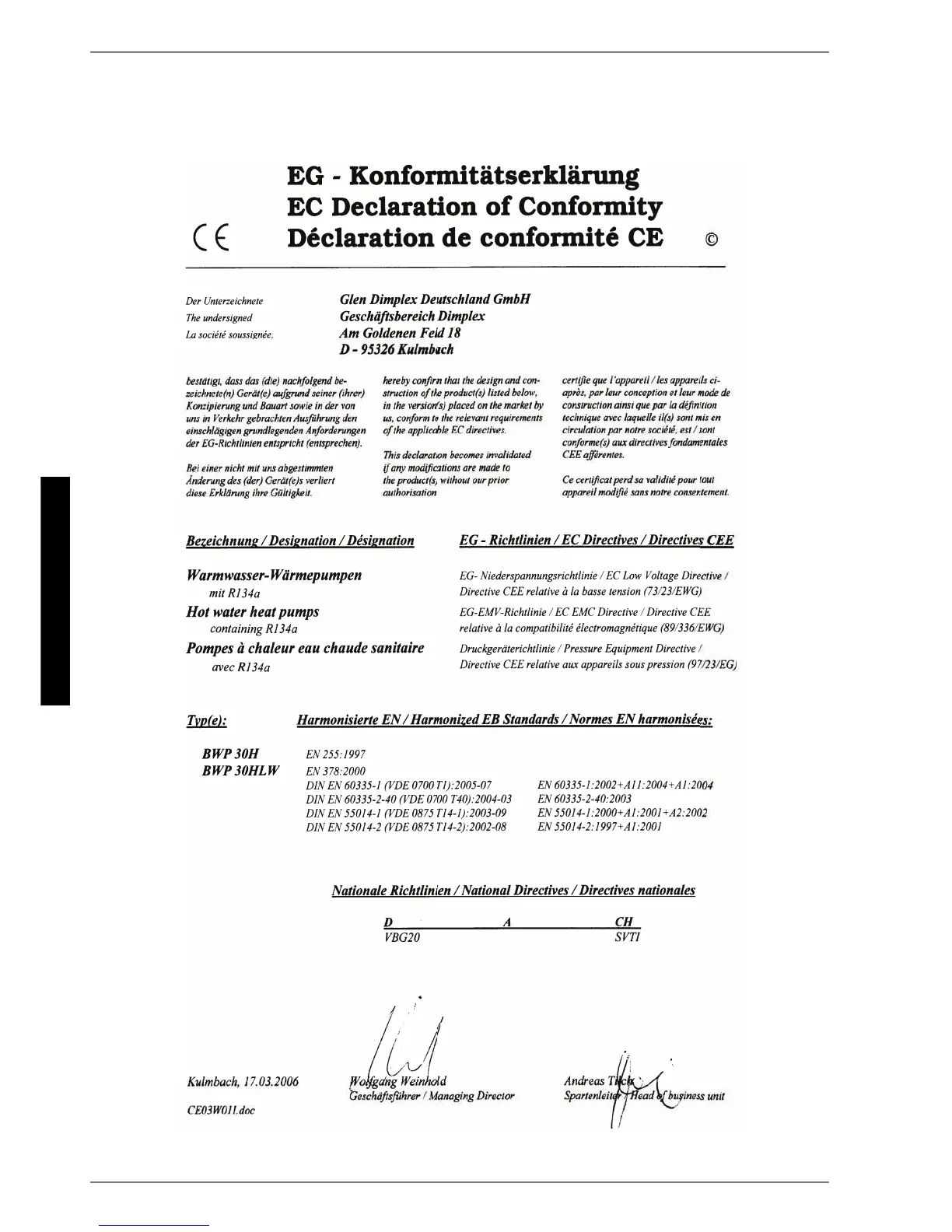Dimplex BWP 30 H - EC Declaration of Conformity
