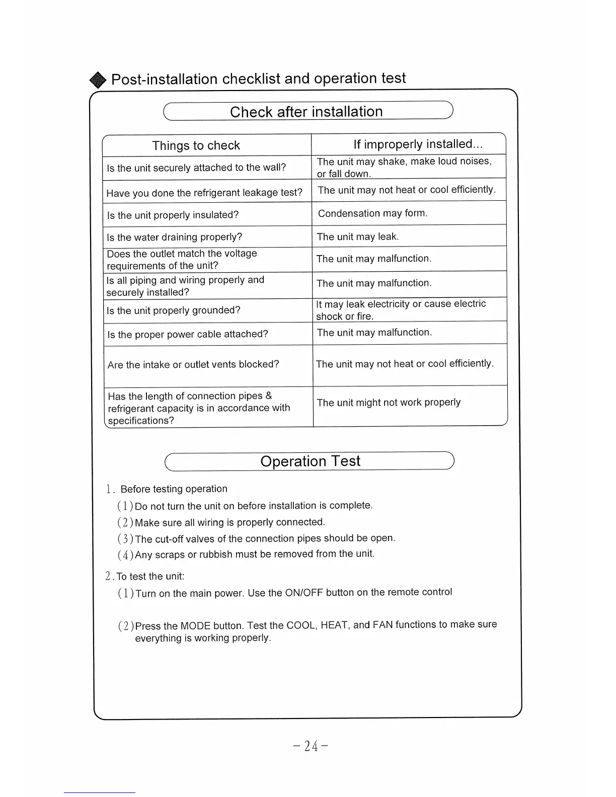 Dimplex GD24I - Post-Installation Checklist and Operation Test; Check after Installation; Operation Test; Before Testing Operation
