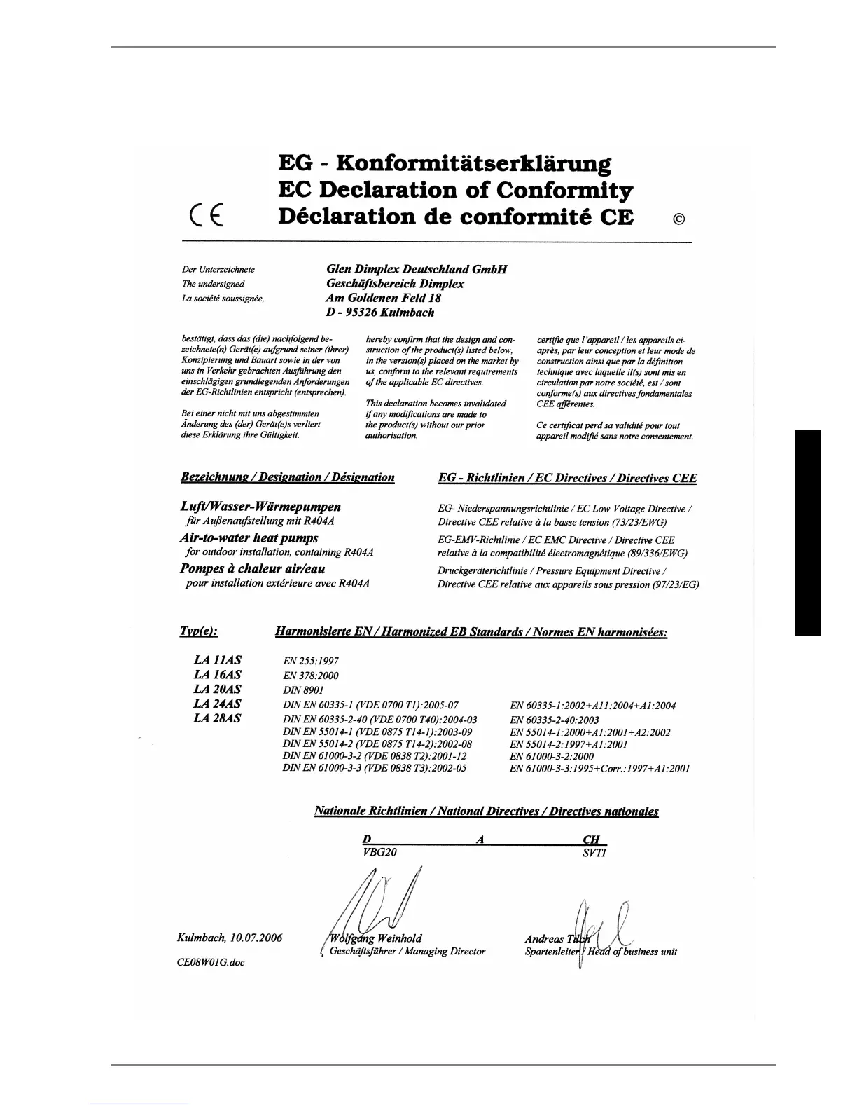 Dimplex LA 20AS - Konformitätserklärung; Declaration of Conformity; Déclaration de Conformité
