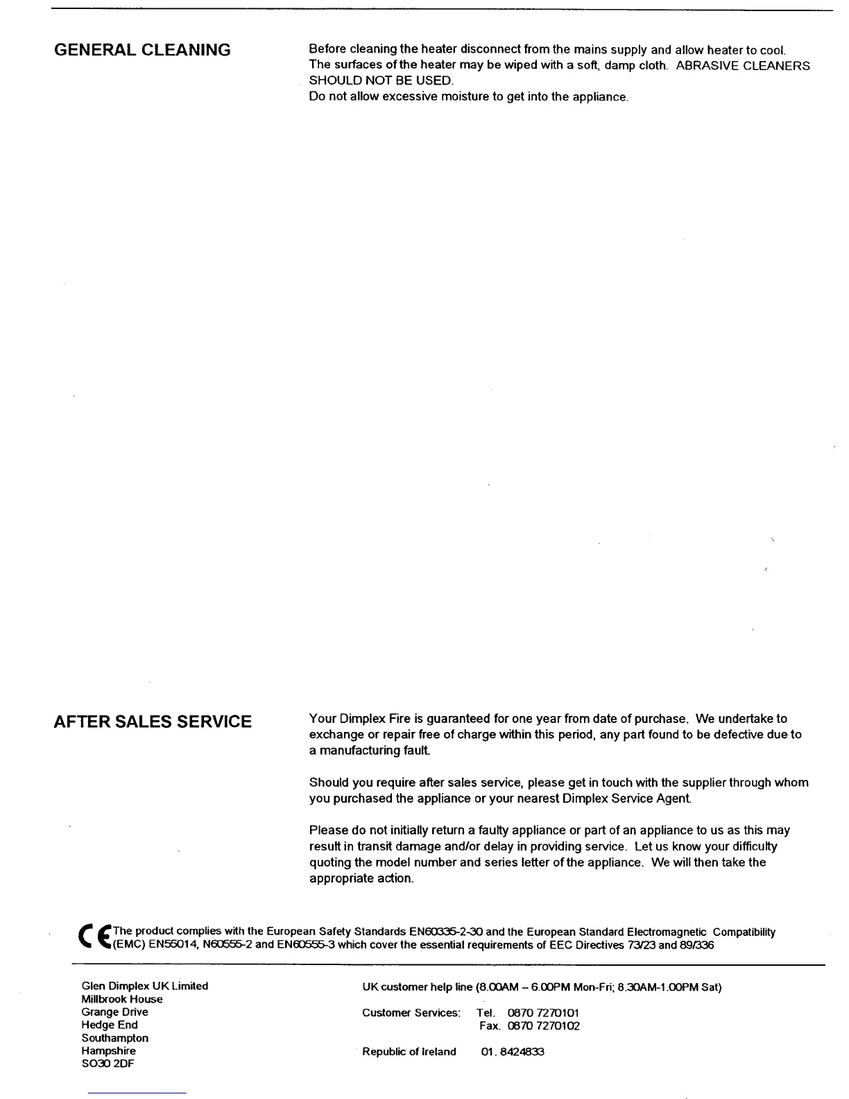 Dimplex LYM28E Lymington - General Cleaning; Cleaning Advice; After Sales Service; Warranty and Support Information