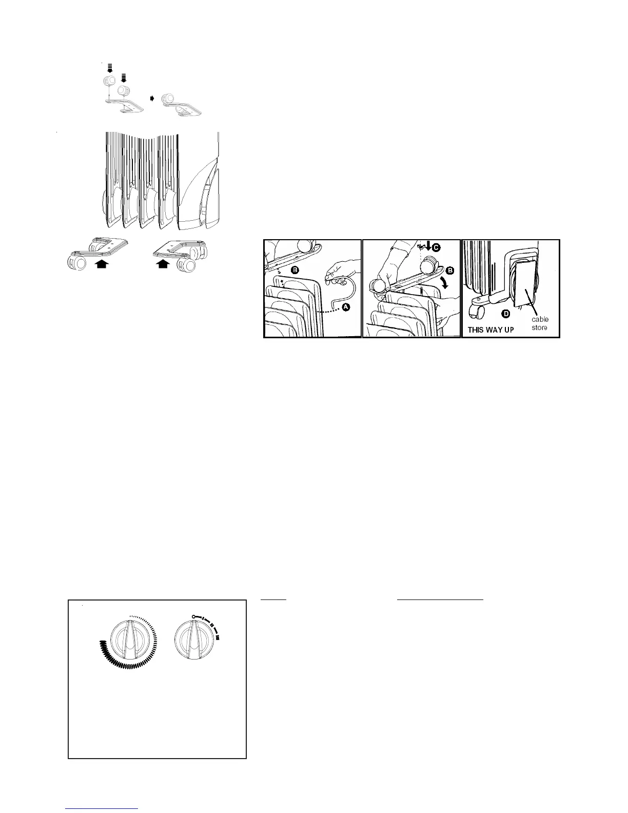 The castors must be fitted between the outer fins (as shown on ‘b’ and ‘c’ in Fig 1).