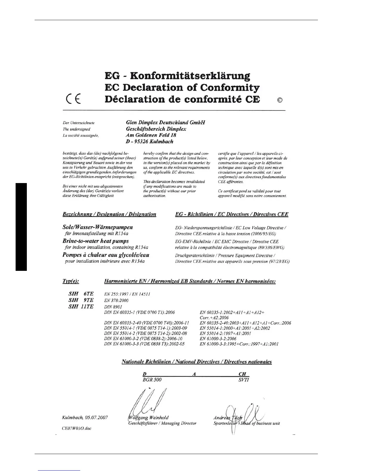 Dimplex SIH 6TE - 5 Konformitätserklärung; Declaration of Conformity; Déclaration de Conformité