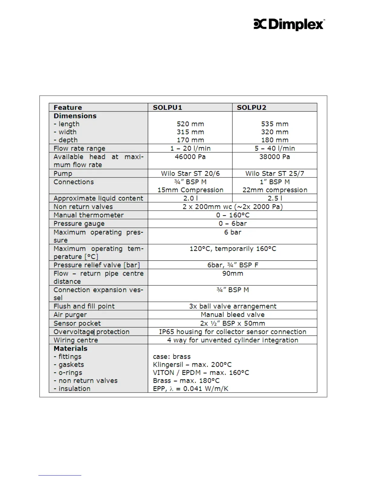 Figure 32 – Technical data Dimplex solar pump unit SOLPU1 and SOLPU2