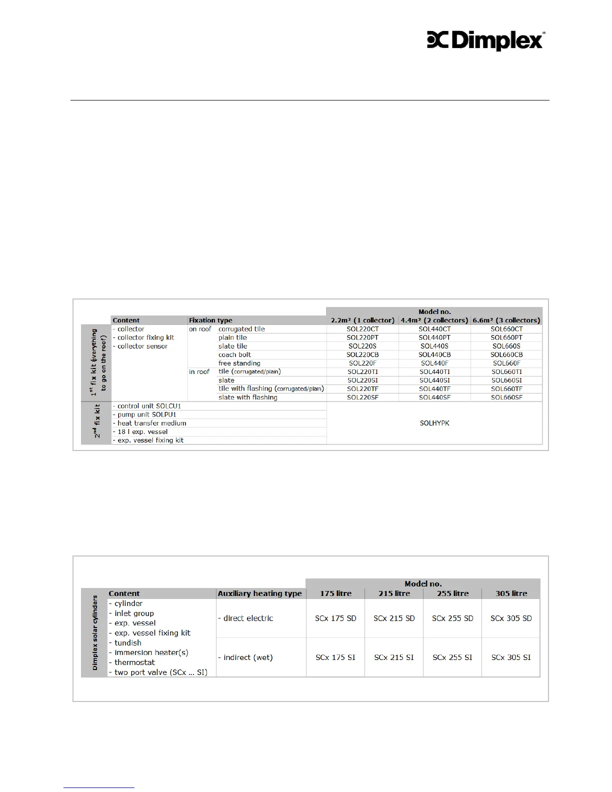 The Dimplex solar product range is offered as kit or as individual components. The fol-