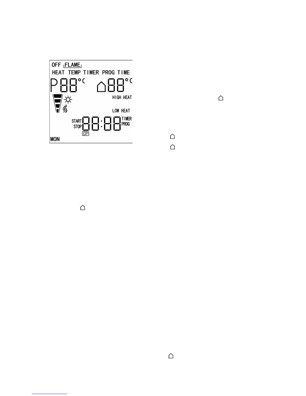 • Main menu points: OFF, FLAME, HEAT, TEMP, TIMER,