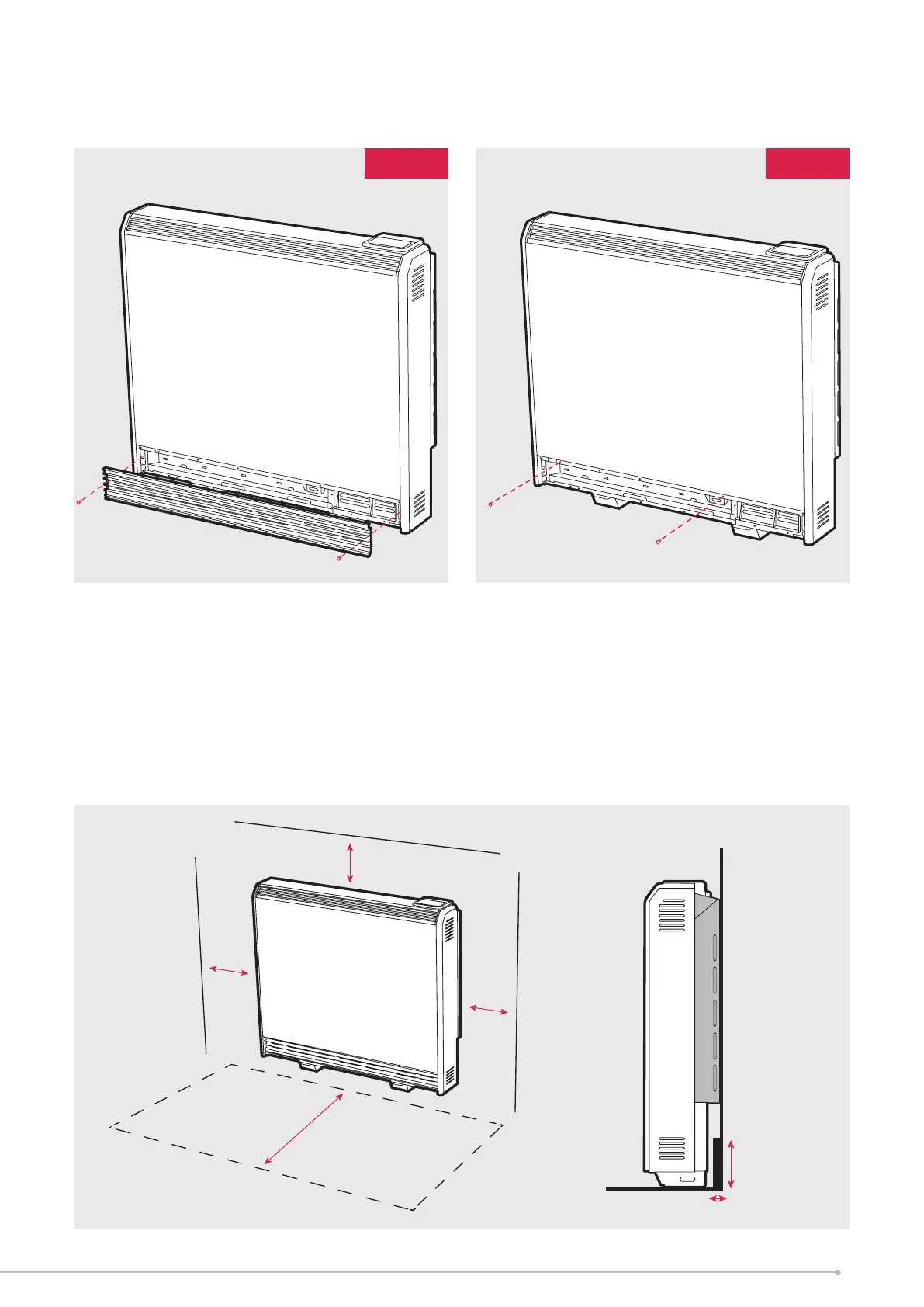 części grzejnika i 150 mm (co najmniej 75 mm) z każdej strony.