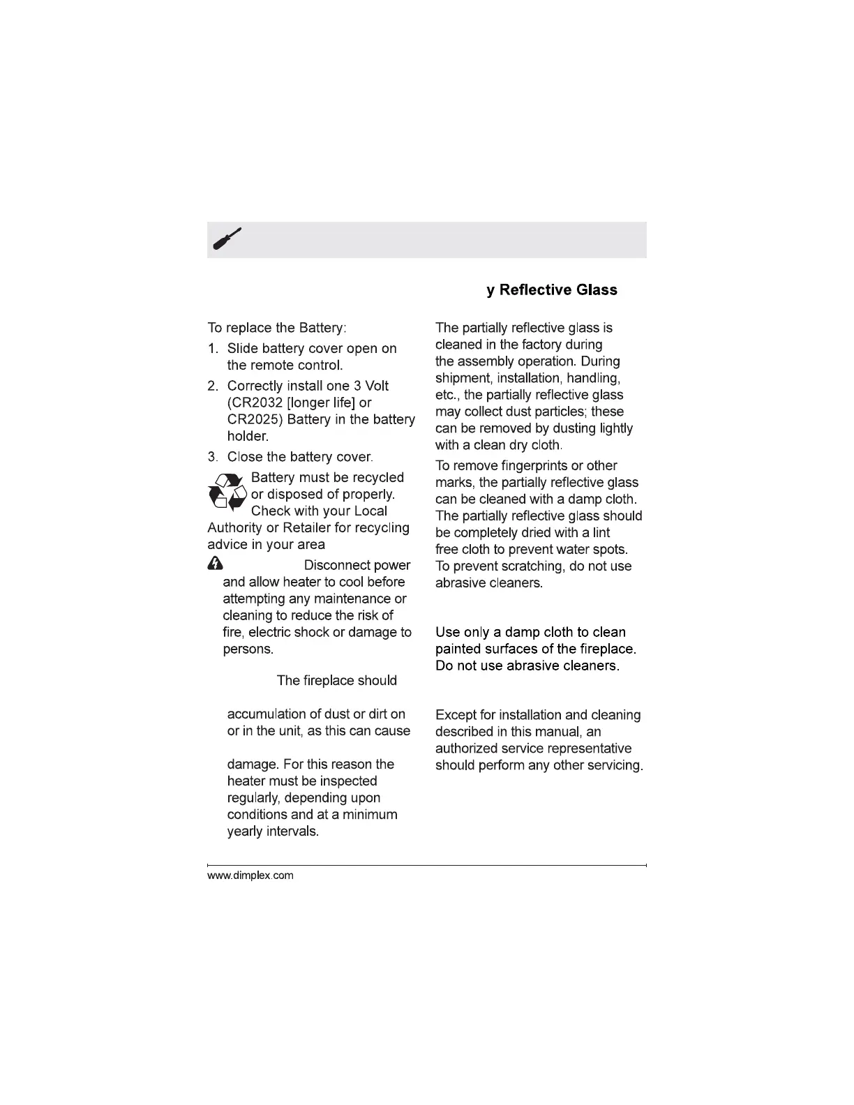 Dimplex XLF50 - Maintenance; Remote Control Battery Replacement; Glass and Surface Cleaning; Servicing Recommendations