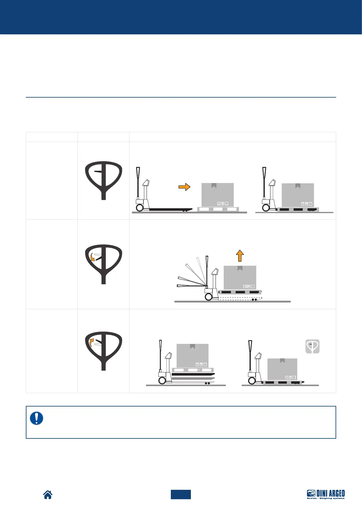 The raised load is moved forwards or backwards by the tiller, which controls the steering wheels. The tiller can be