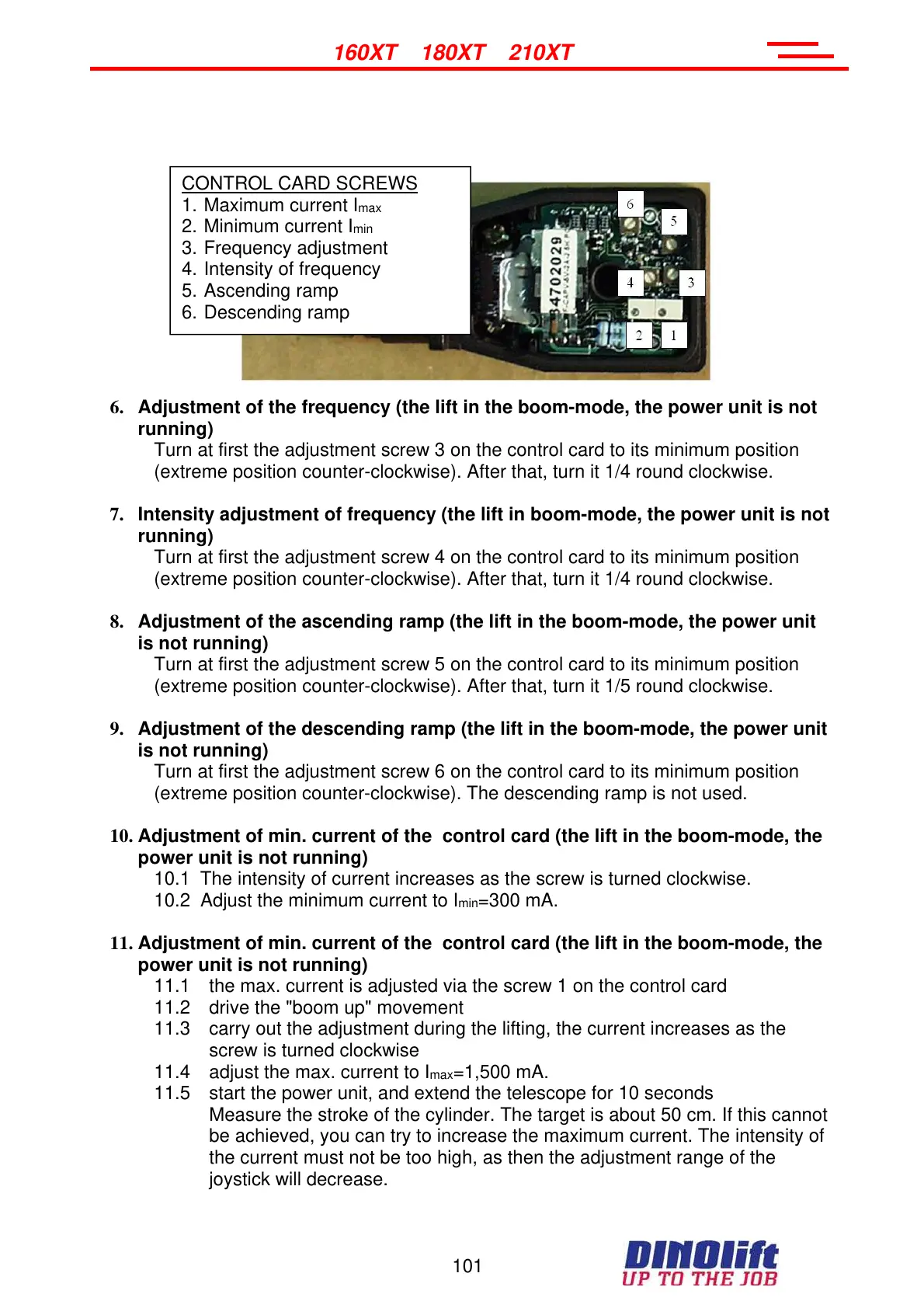 10. Adjustment of min. current of the control card (the lift in the boom-mode, the