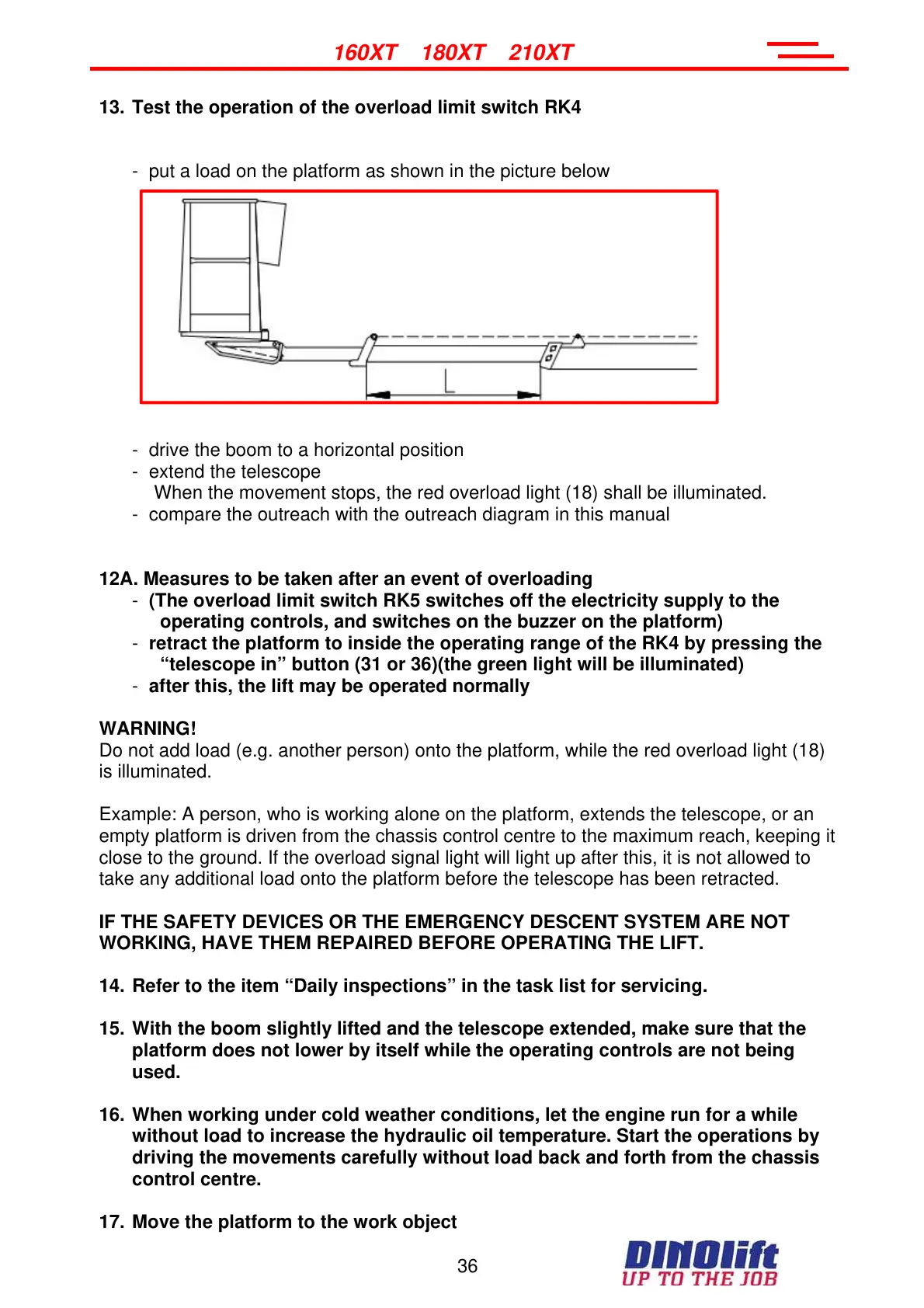 15. With the boom slightly lifted and the telescope extended, make sure that the