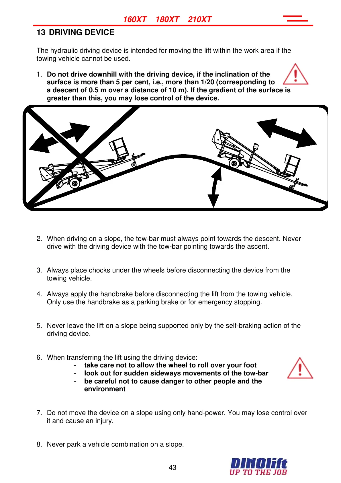 2. When driving on a slope, the tow-bar must always point towards the descent. Never