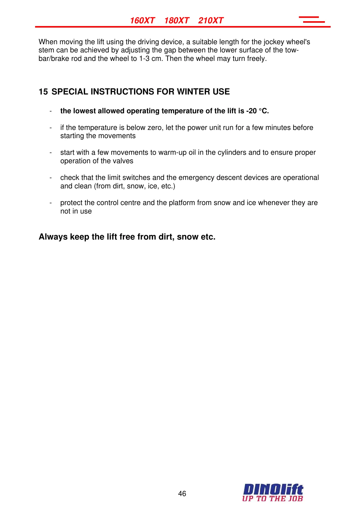 Always keep the lift free from dirt, snow etc.