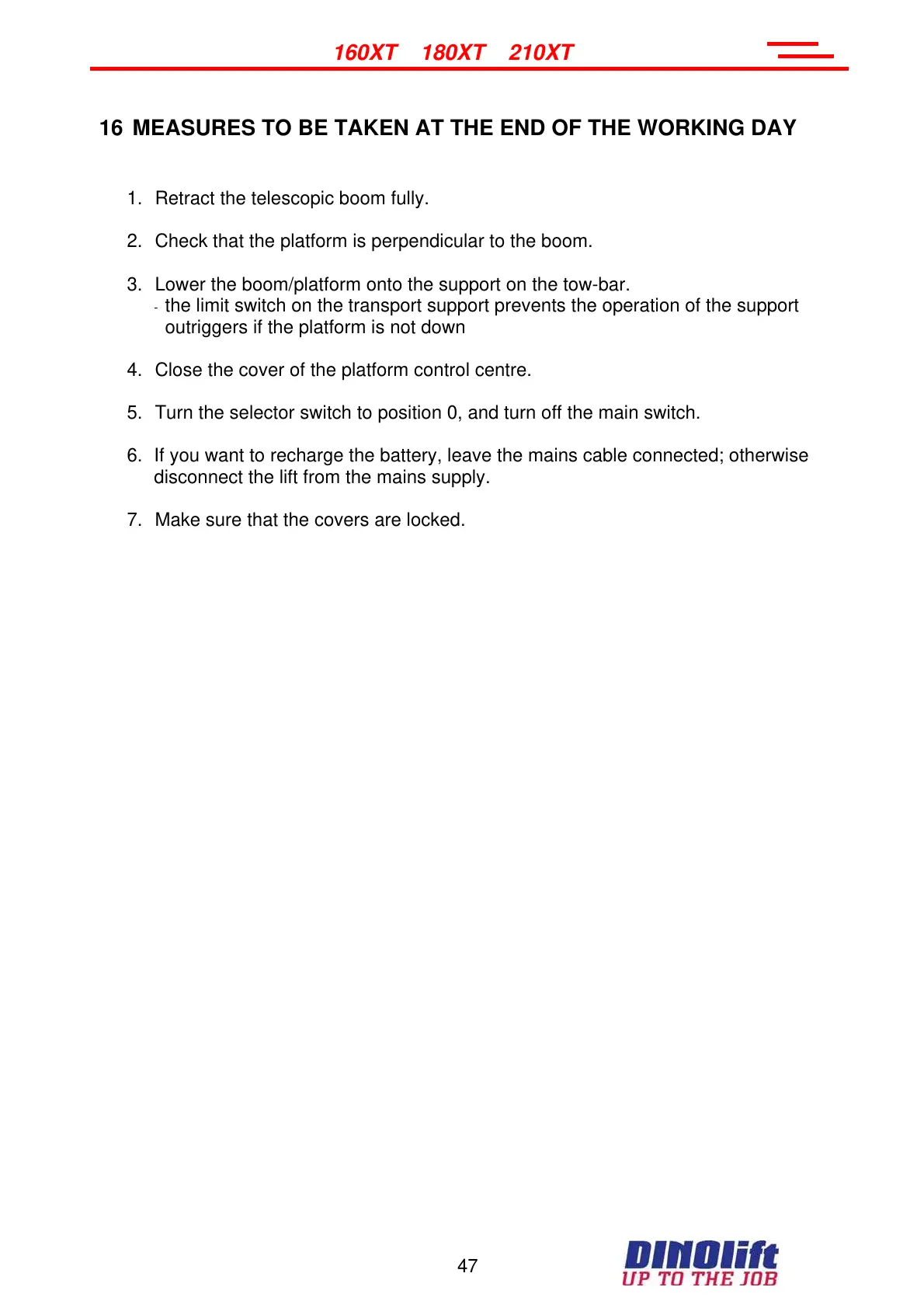 1. Retract the telescopic boom fully.