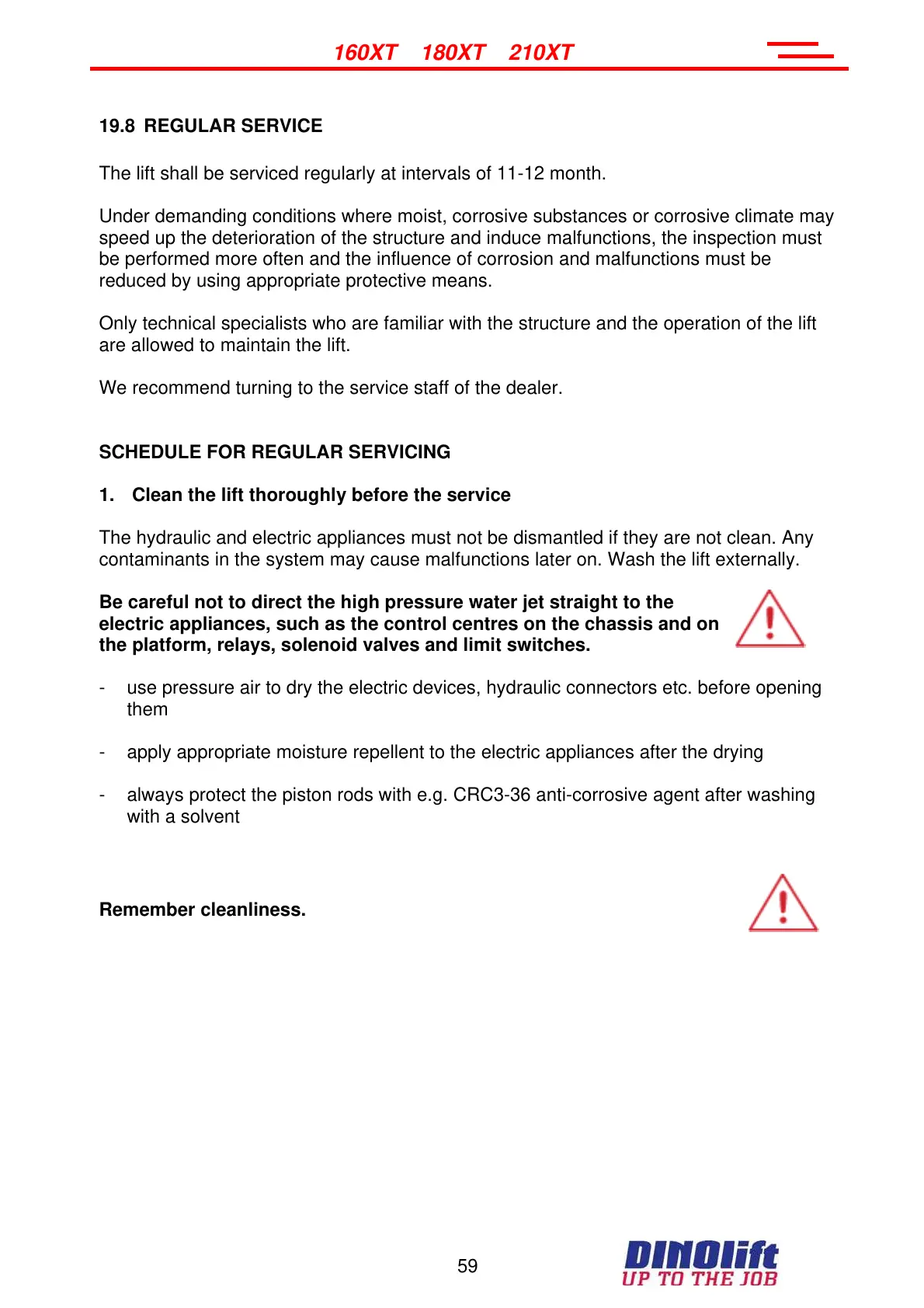 contaminants in the system may cause malfunctions later on. Wash the lift externally.