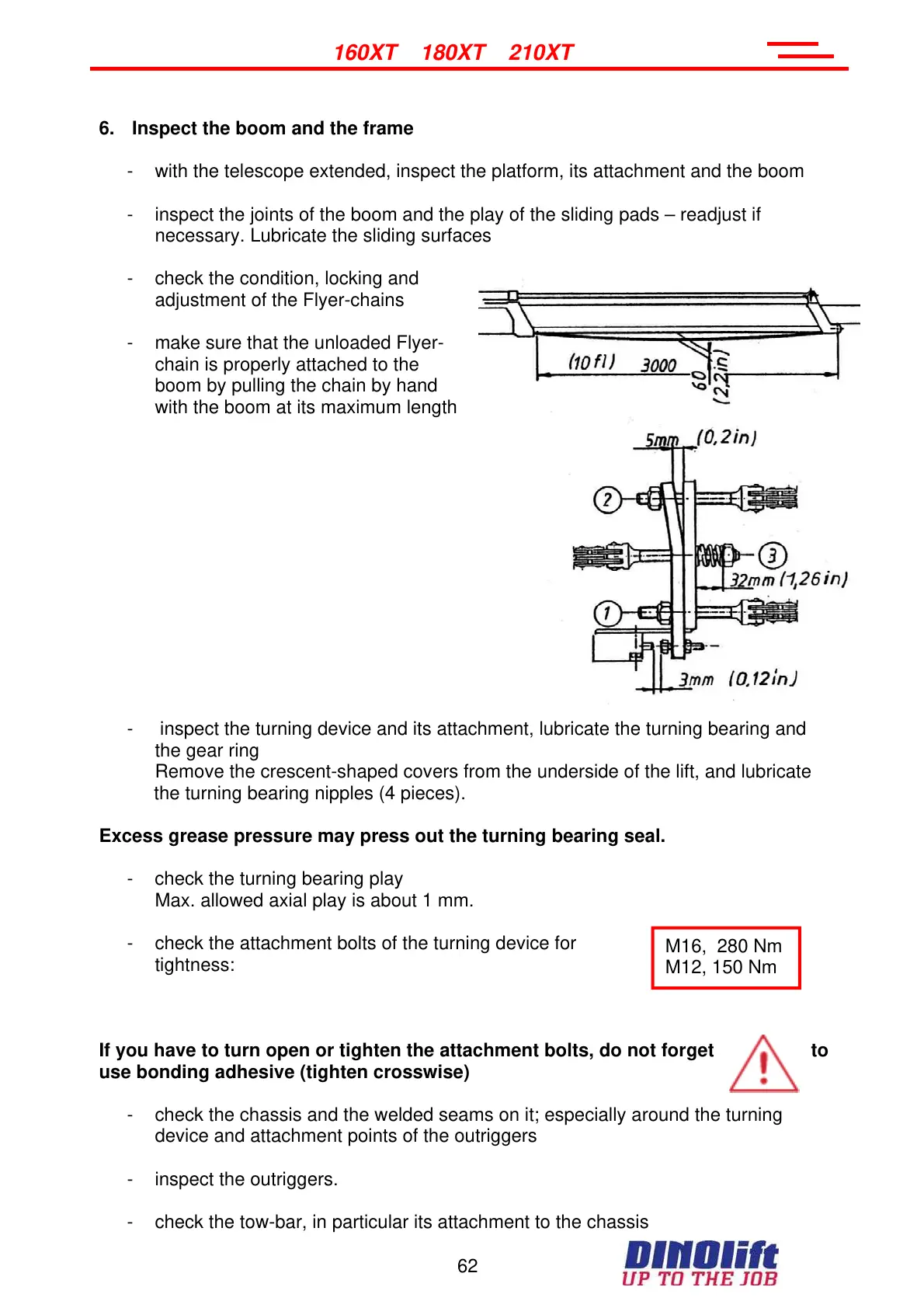 - inspect the turning device and its attachment, lubricate the turning bearing and