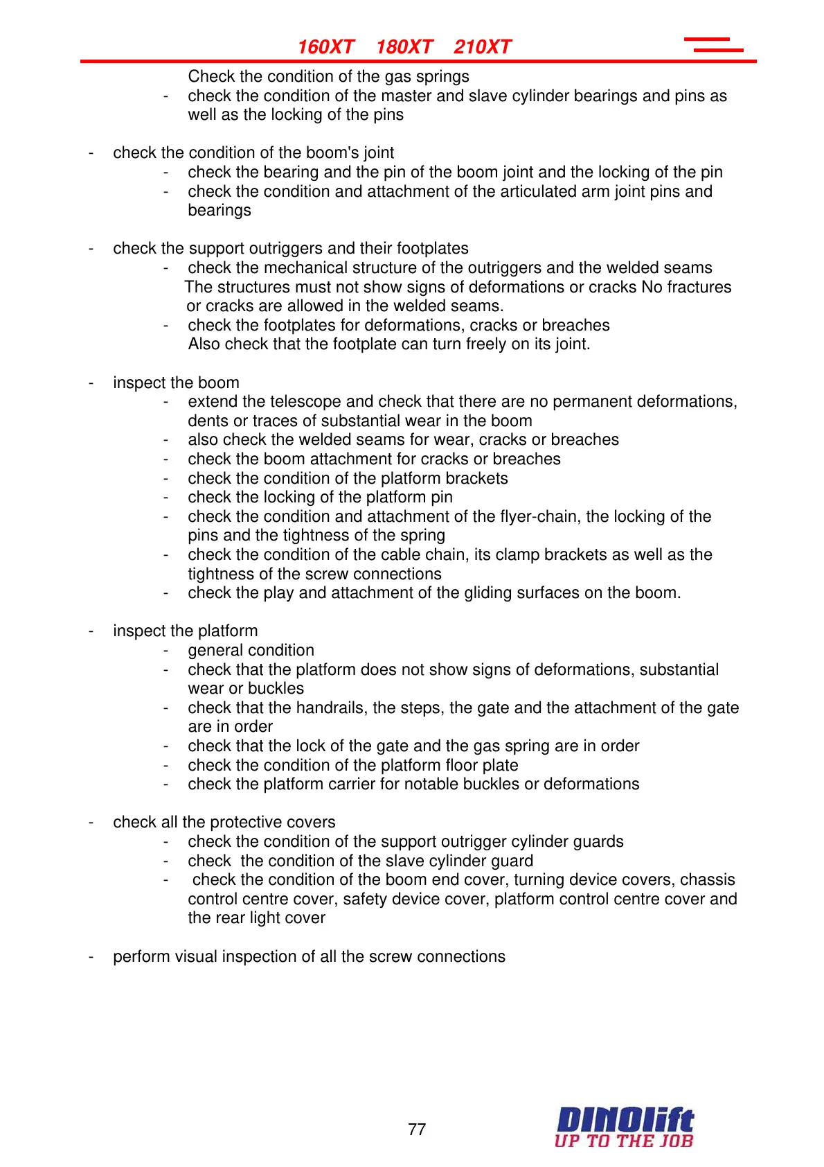 - check the bearing and the pin of the boom joint and the locking of the pin