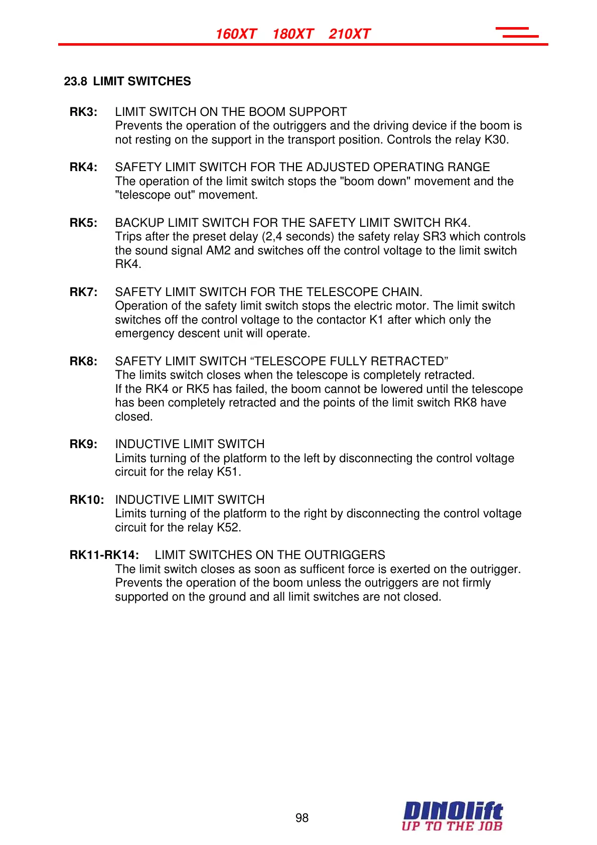 The operation of the limit switch stops the "boom down" movement and the