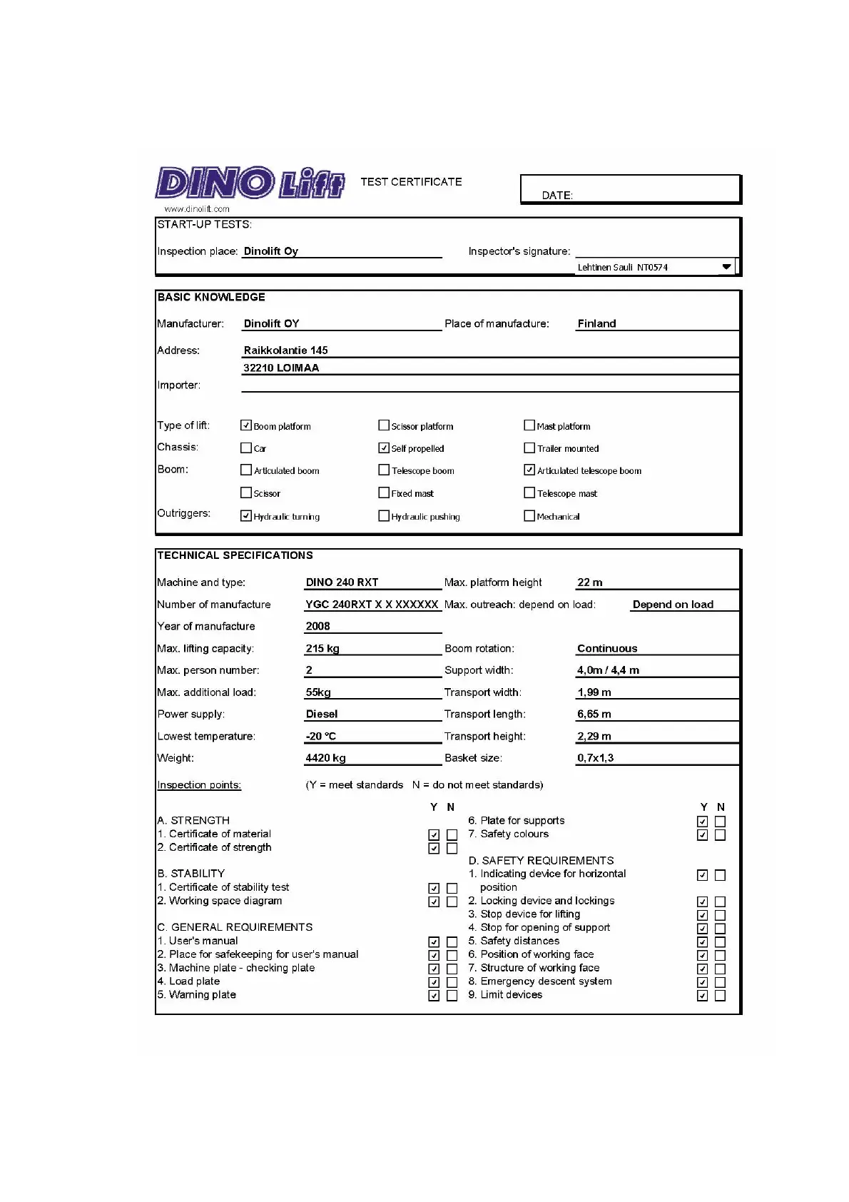Dinolift 240RXT - Sample Inspection Protocol