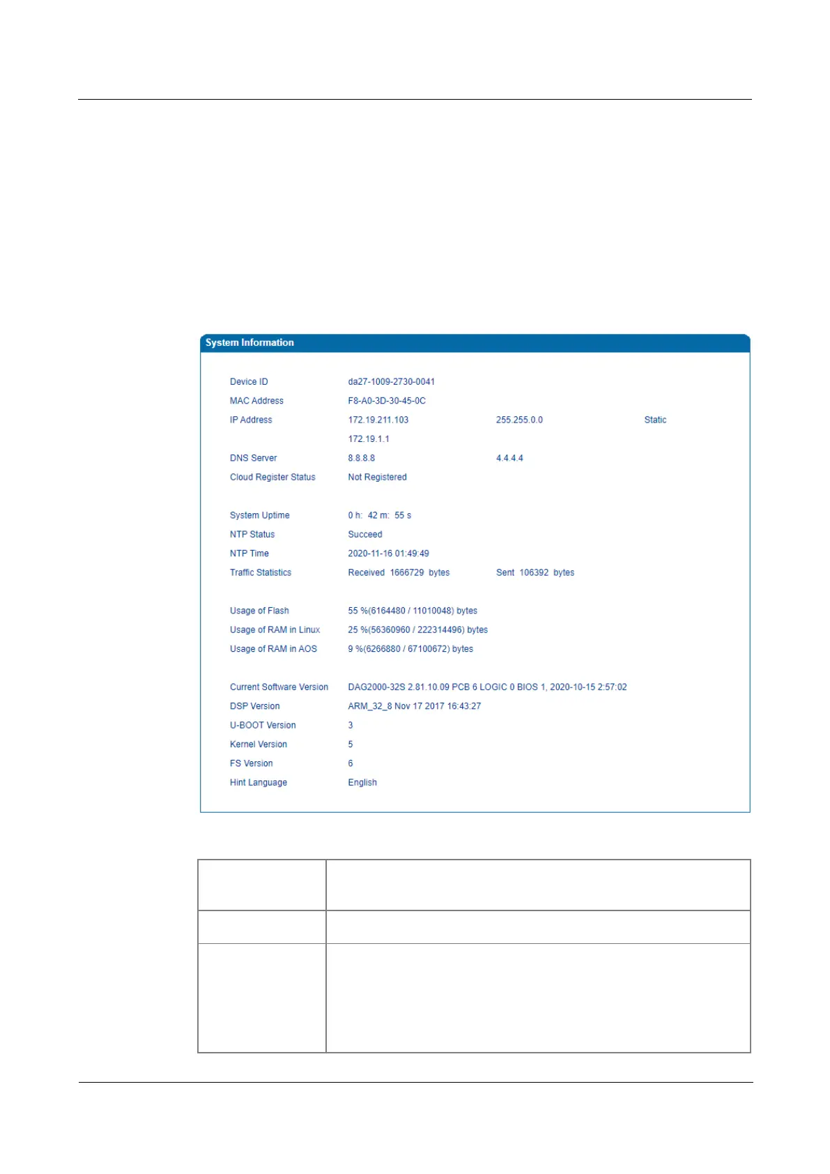 Table 4-1 Explanation of Items on System Information Interface: