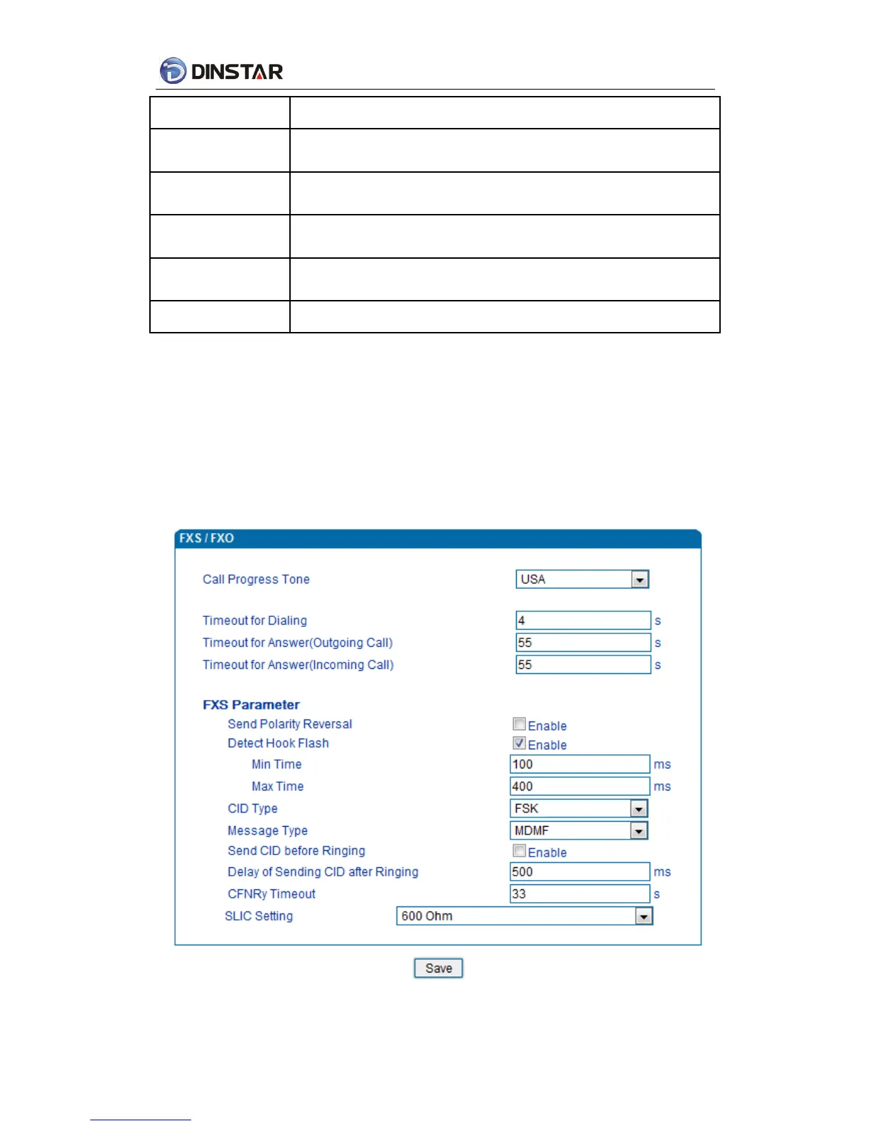FXS characteristic parameters include: Call progress Tone, Timeout for Dialing, Send