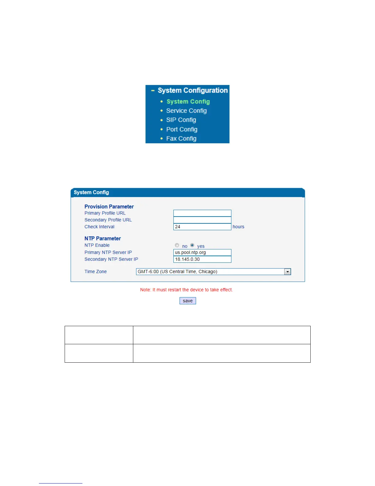 System parameter includes 1) System Config 2) Service Config 3) SIP Config 4) Port Config 5)