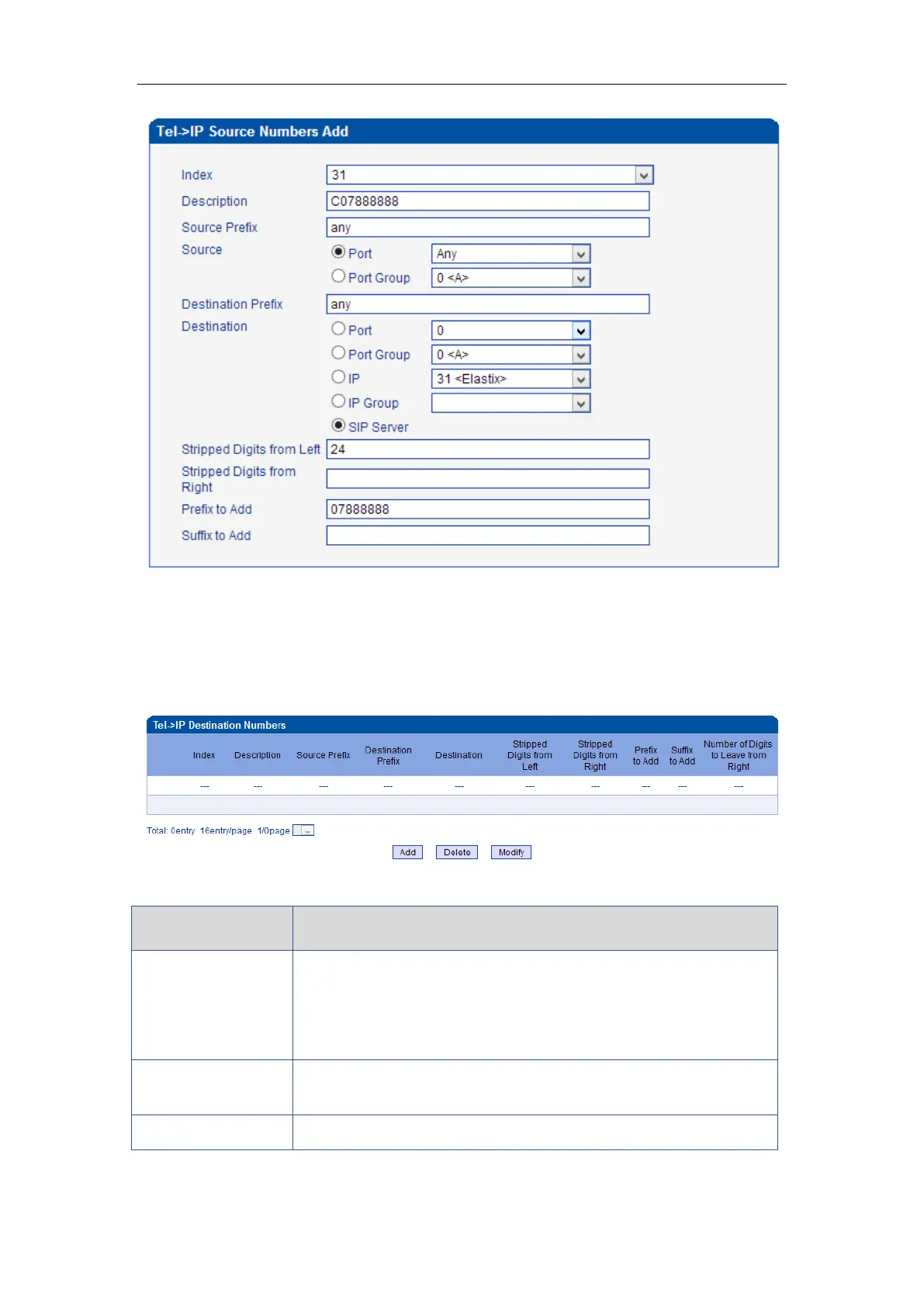 Table 4-8-3 Description of Tel->IP destination numbers manipulation