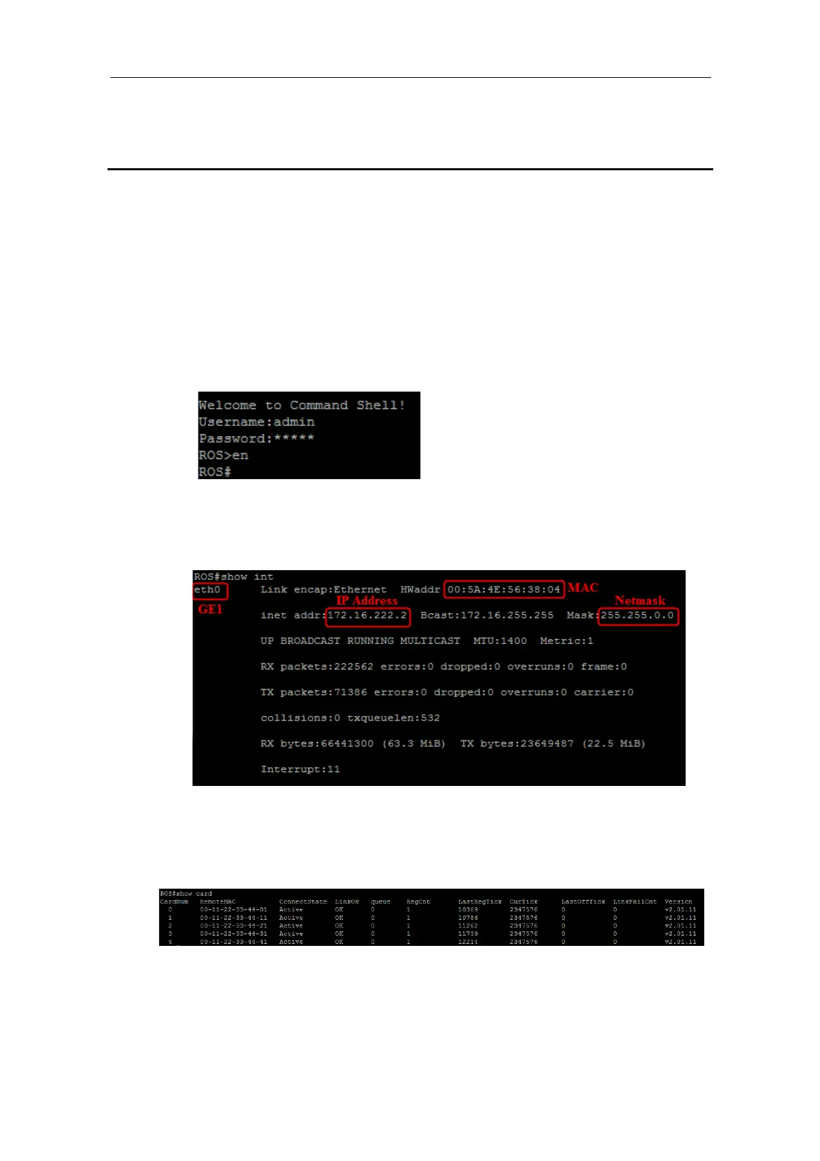 Enter the command show int, IP address, MAC address and Netmask of GE1 are displayed.