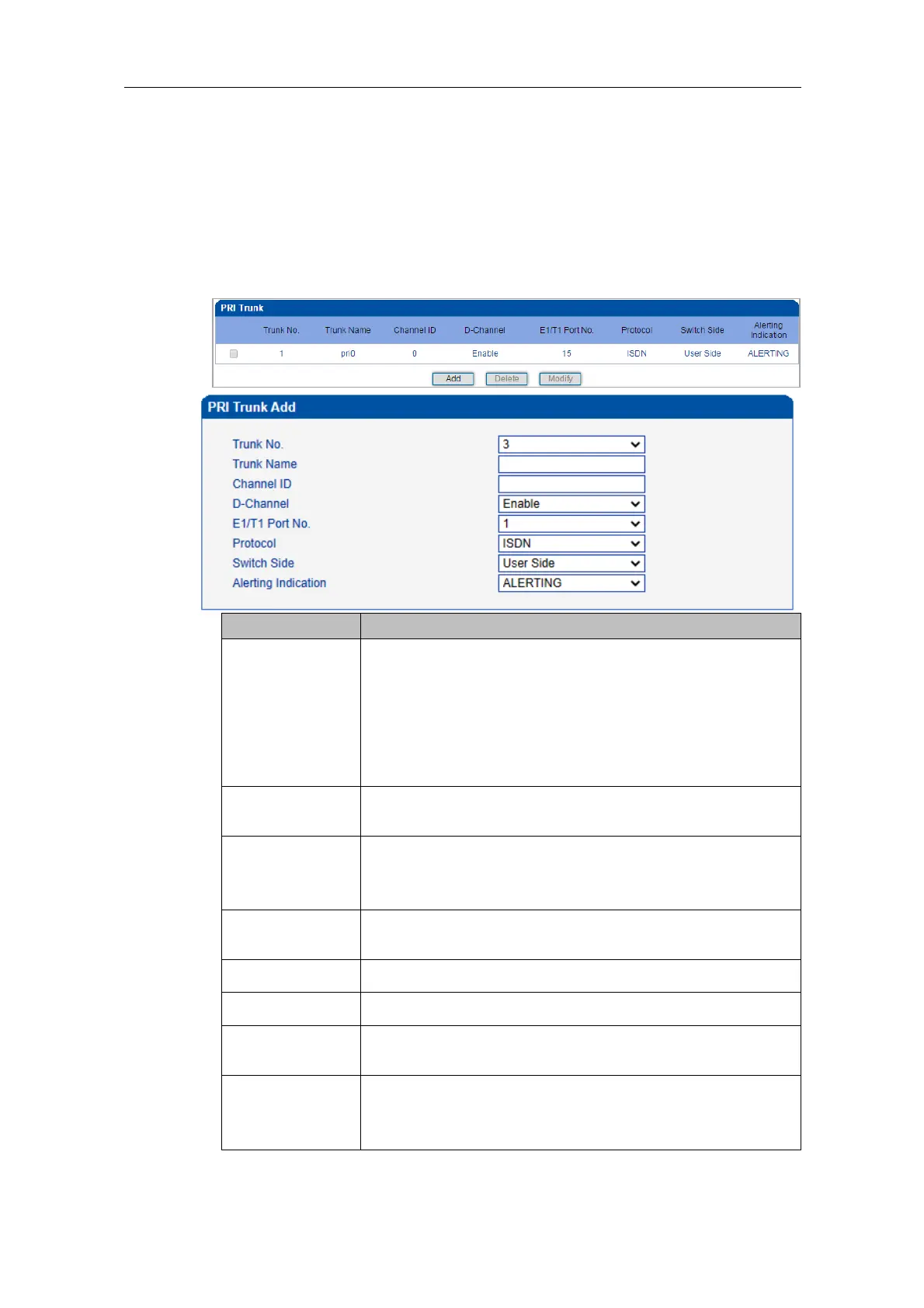 Click the Add button, and you can add a PRI trunk. If you want to delete or modify the