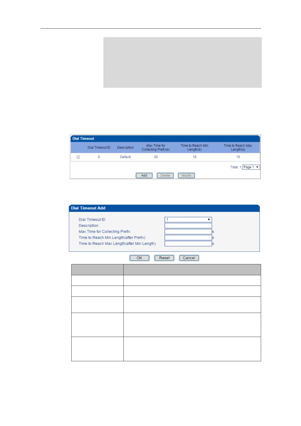 The setting in Dial Timeout 0 is default setting, which can be modified but cannot be deleted.