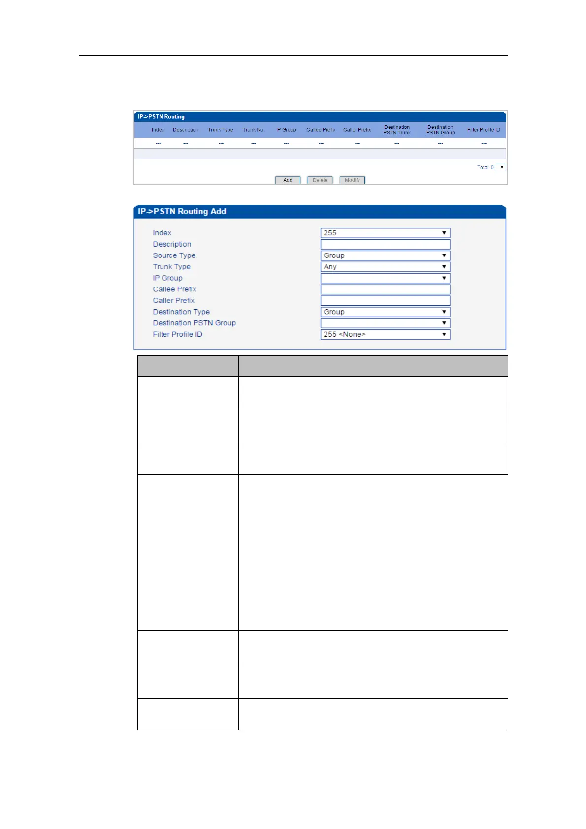 On the PSTN -> IP Routing interface, you can set routing parameters for IP -> PSTN calls.