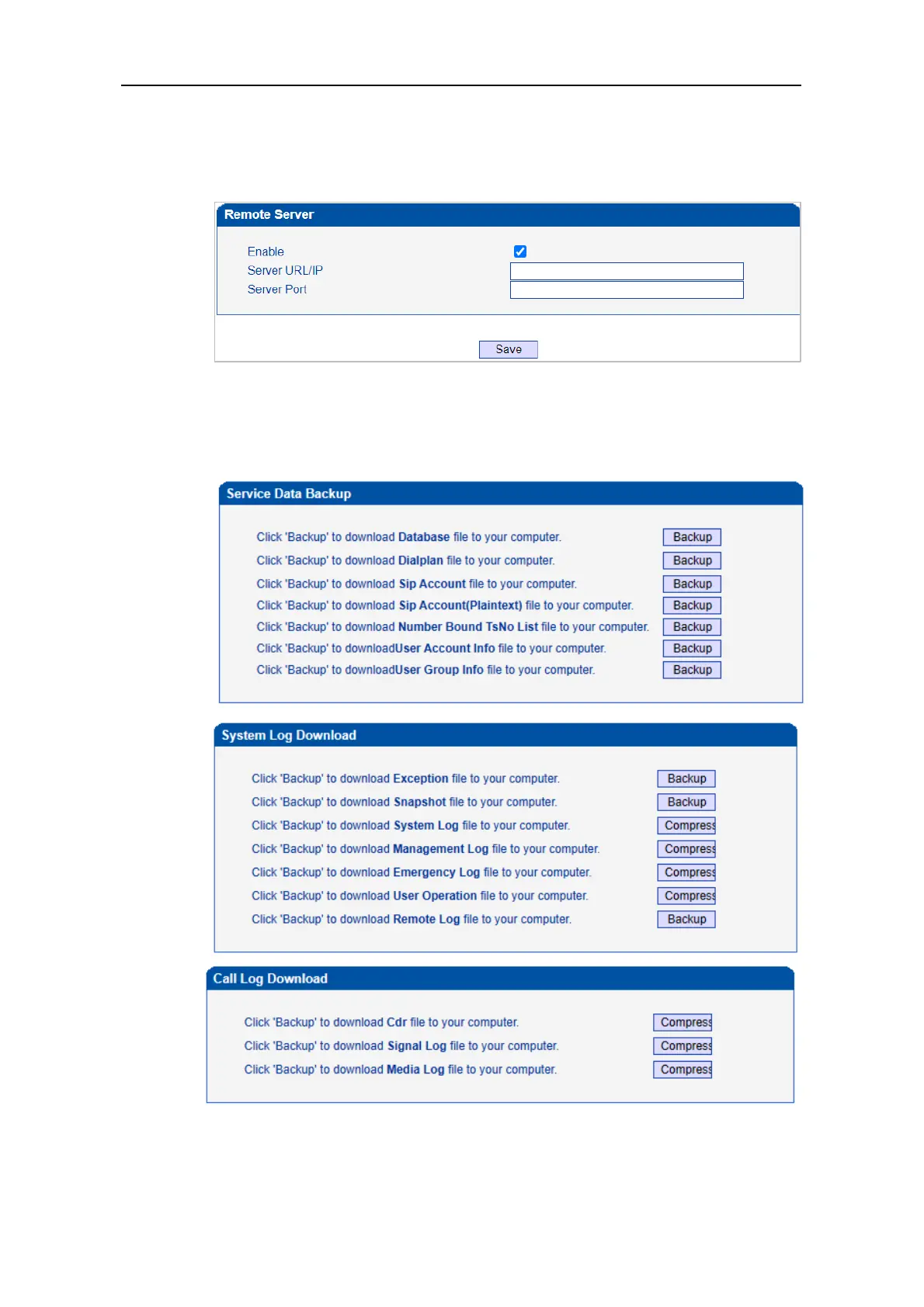 Through data download, service data, system logs, call logs, userboard logs, etc. can be