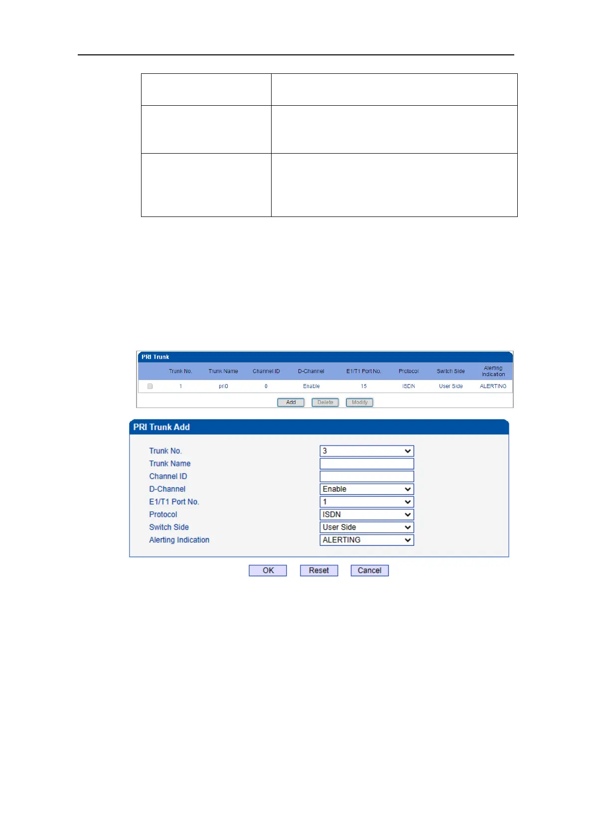 Click the Add button, and you can add a PRI trunk. If you want to delete or modify the