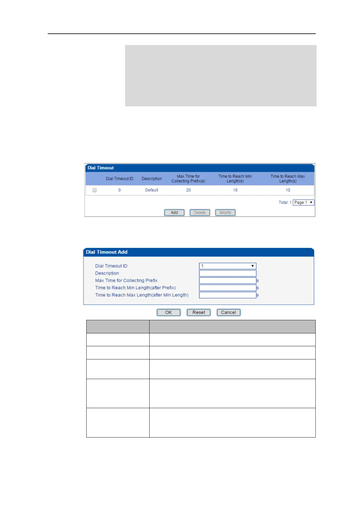 The setting in Dial Timeout 0 is default setting, which can be modified but cannot be deleted.