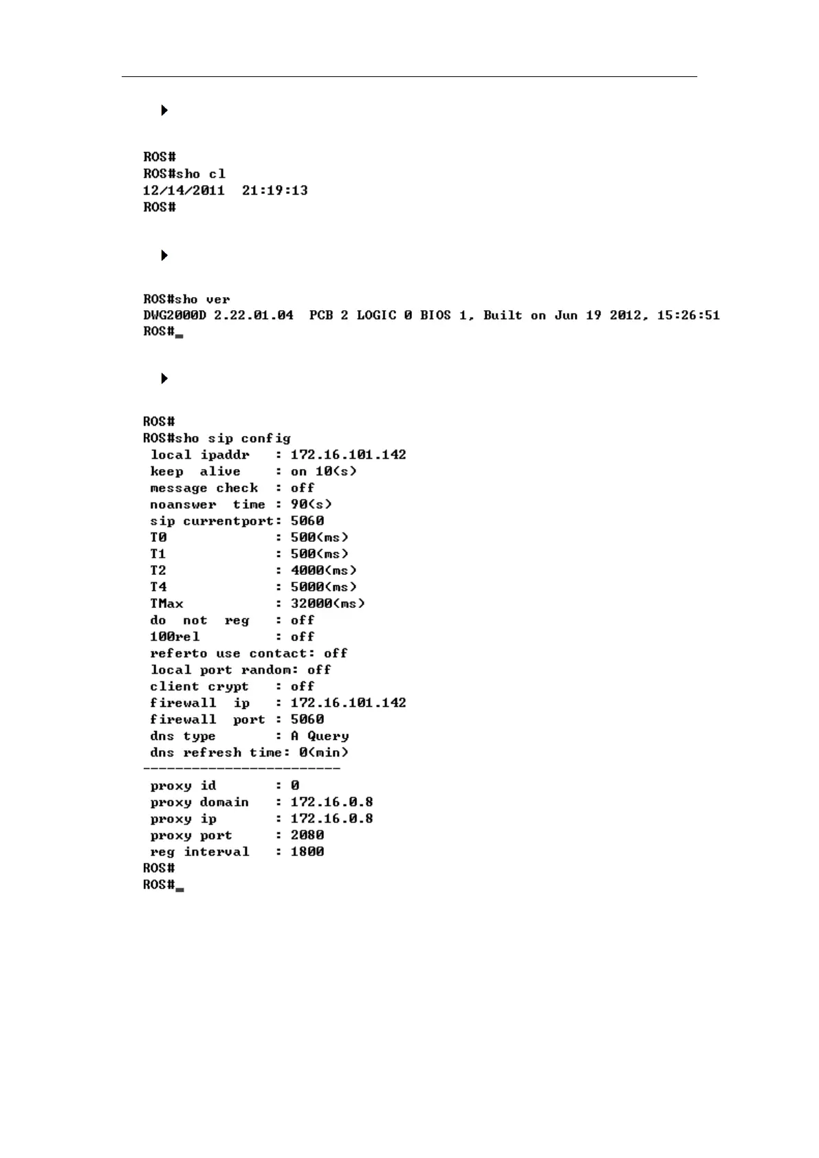 Dinstar UC2000-VE - Show Time (Show Clock); Show Version (Show Version); Show Sip Information (Show Sip Config)