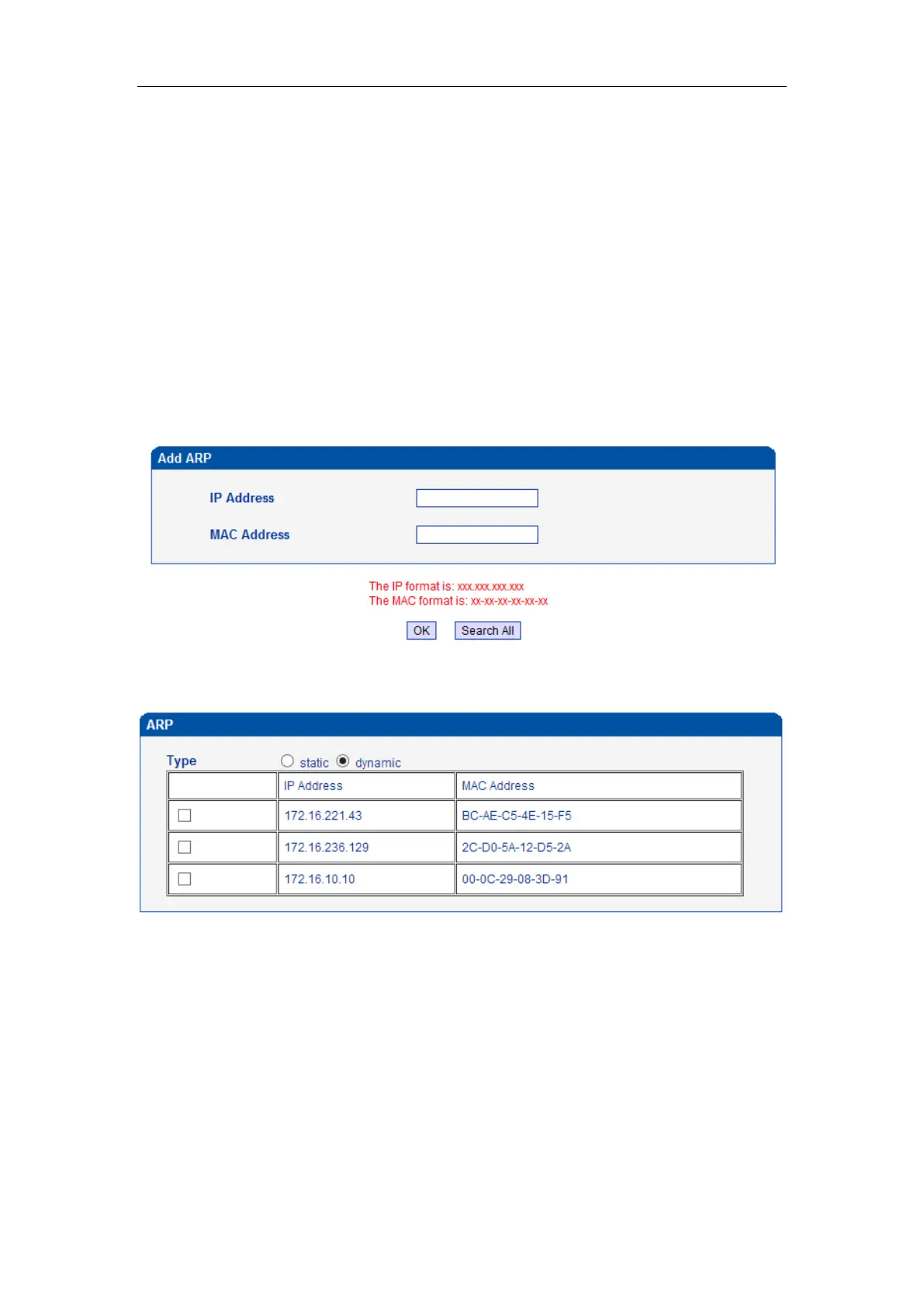 The ARP function mainly used to query and add the map of IP and MAC. There are static or