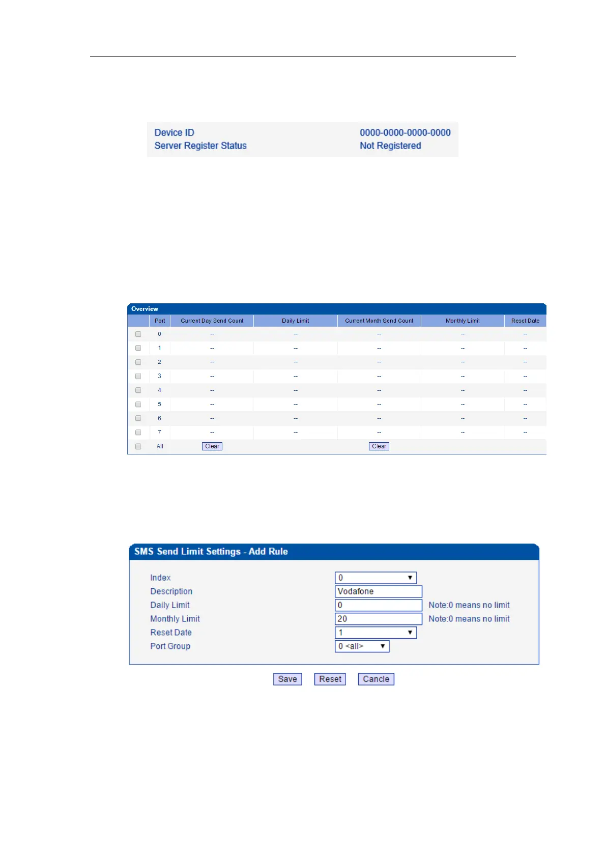 been sent via the ports of the gateway, as well as the daily limit and monthly limit of SMS