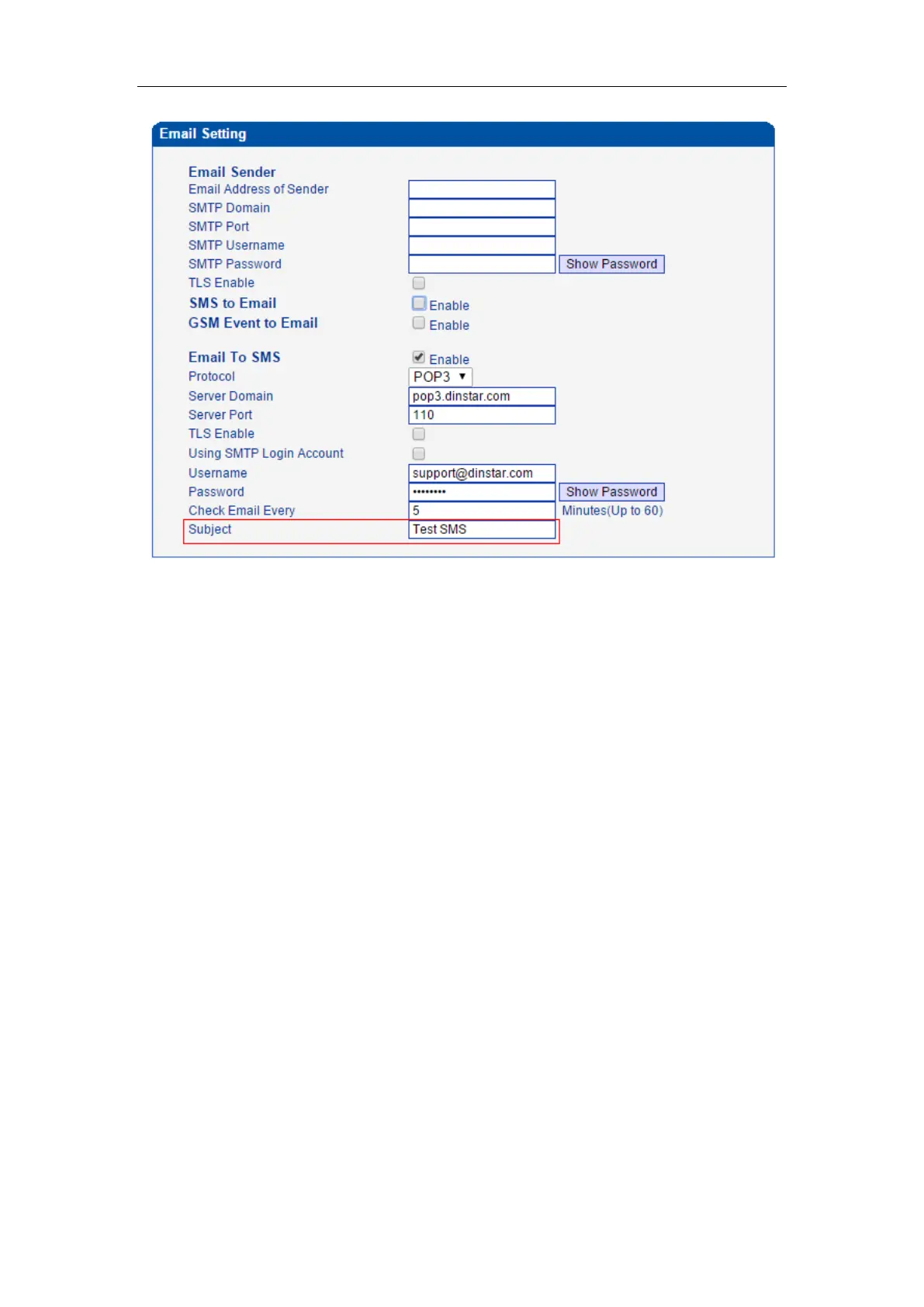 email with subject “Test SMS”, the Subject s field in GSM gateway must be “Test