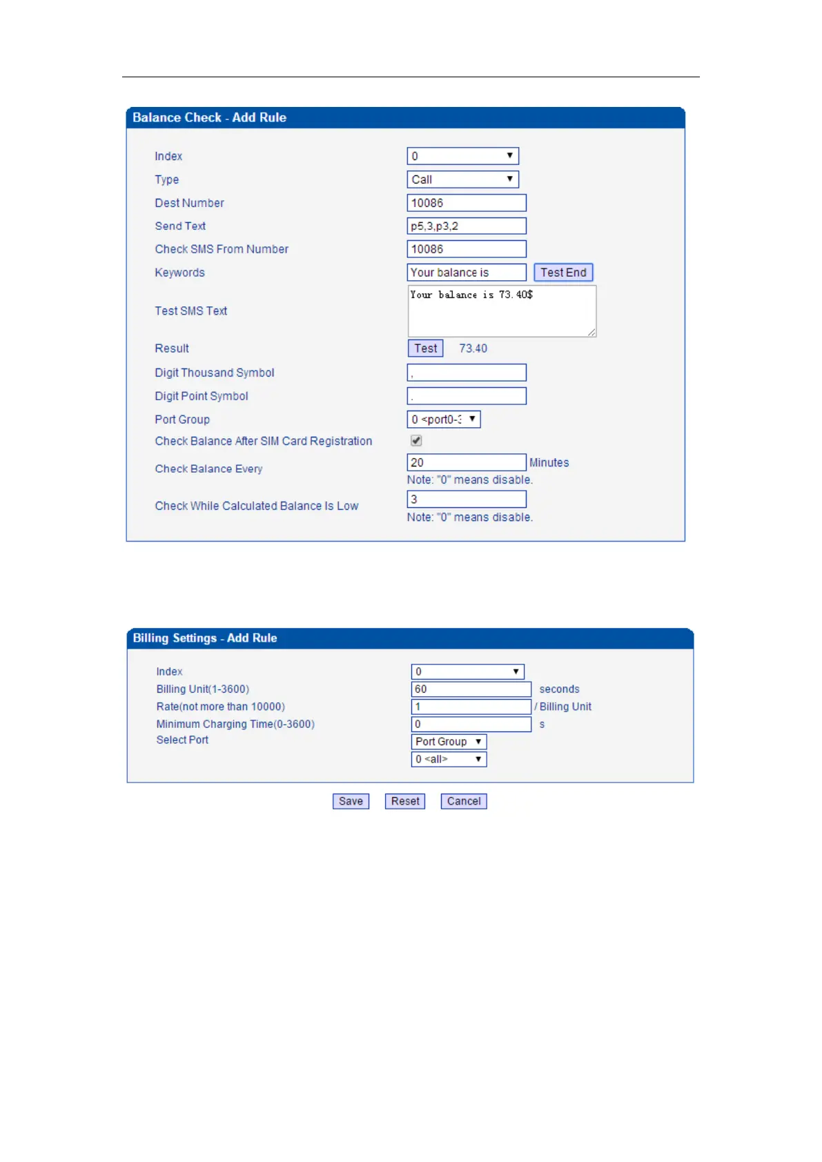 Billing setting mainly use to limit call time of SIM cards, see also call limit.