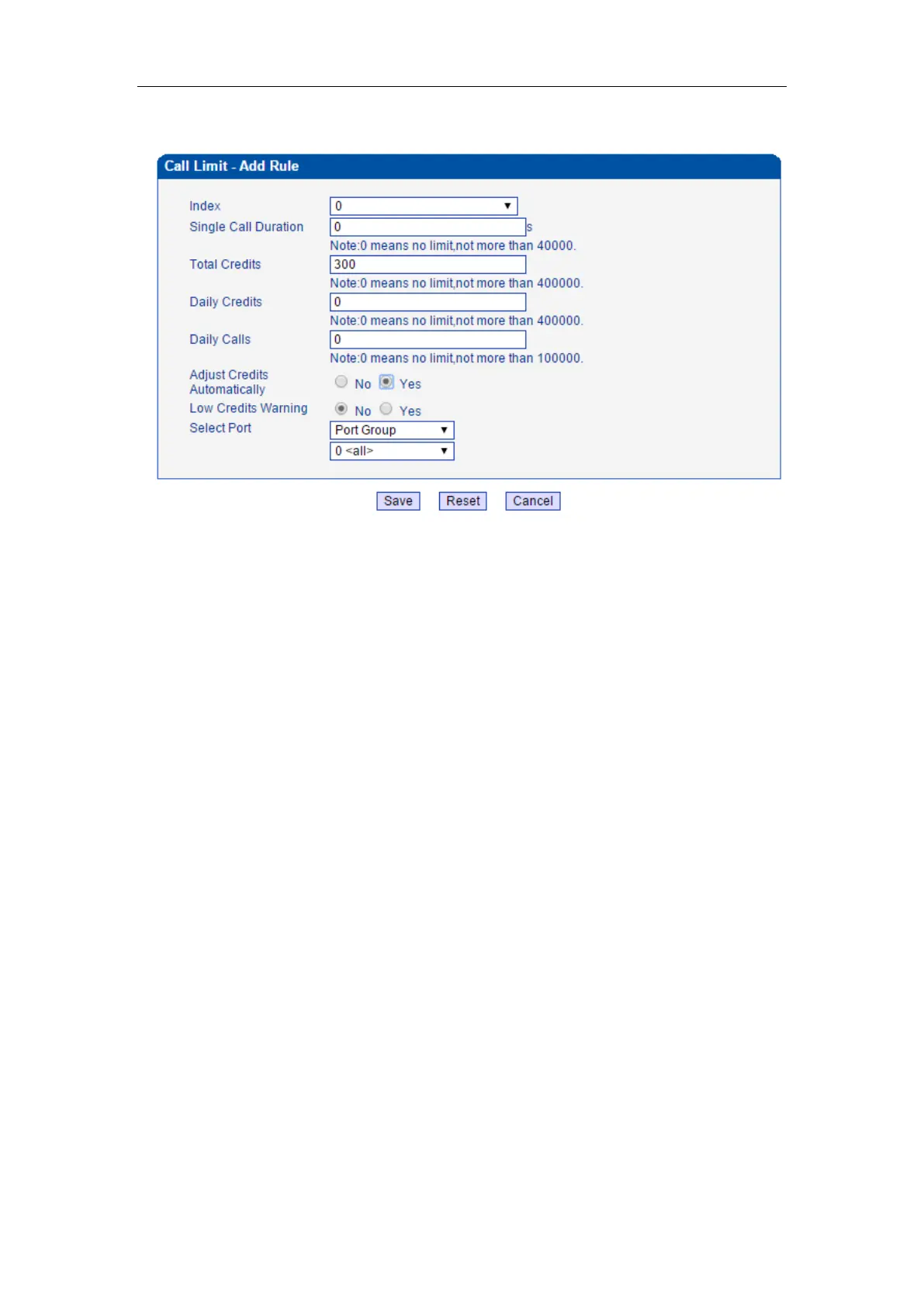 Single Call Credits: set single call credits, it defines the maximum credit every single