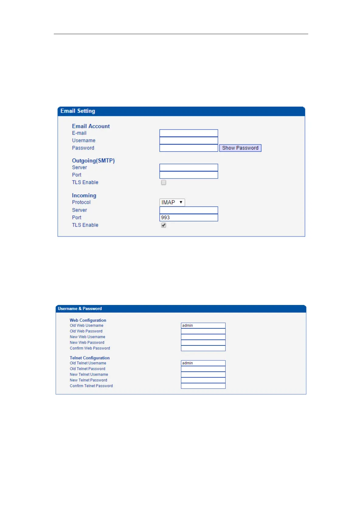 When using web or telnet Configuration, please enter default user name and password. User