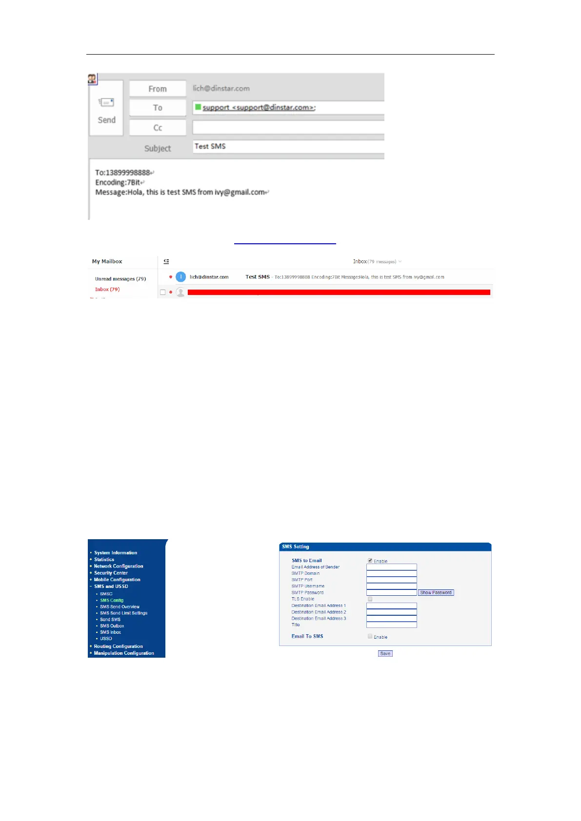 box. Login device’s web, go to SMS and USSD-->SMS Config page, enable SMS to Email