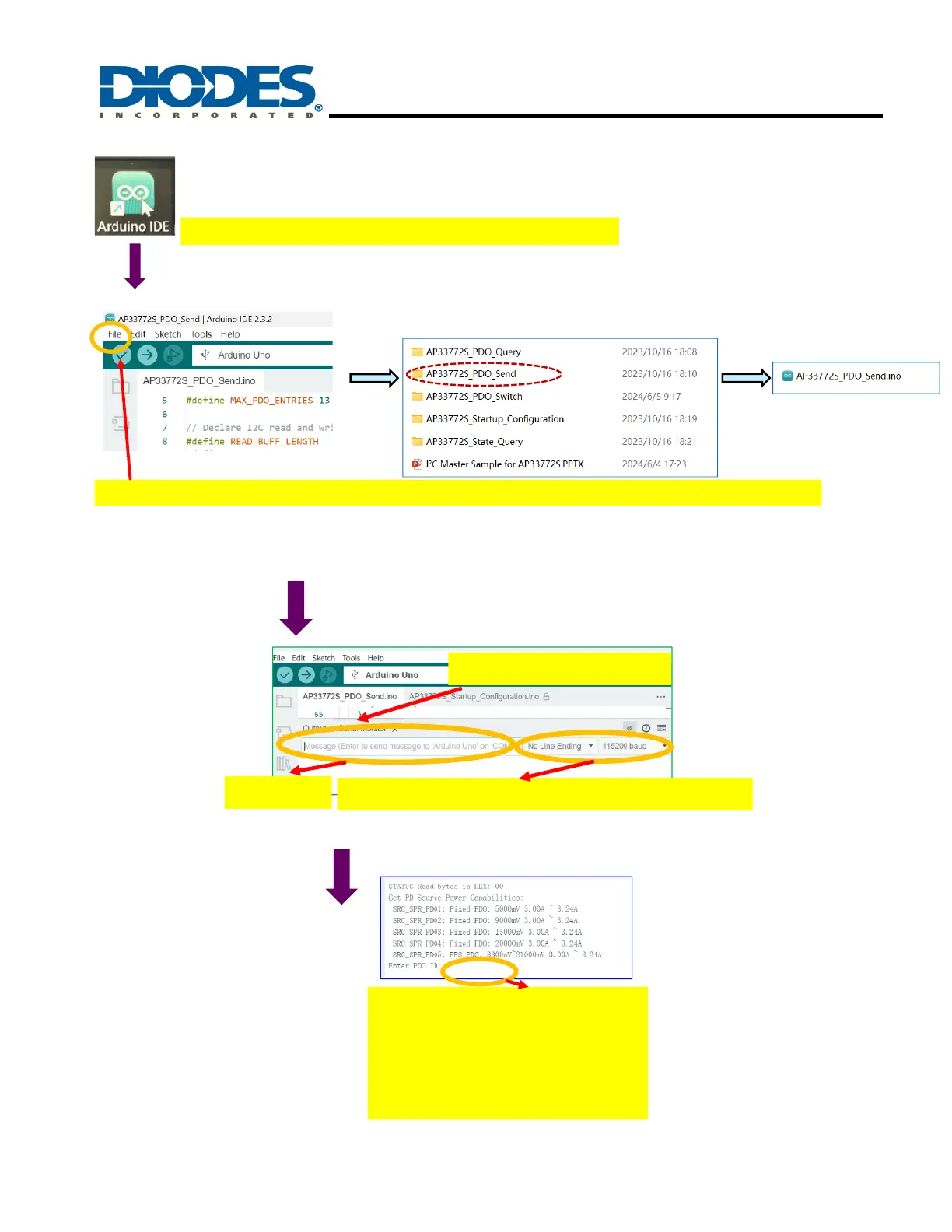 Click “ File”-> click “Open”-> click fold “AP33772S_PDO_Send”->select file ““AP33772S_PDO_Send.ino”