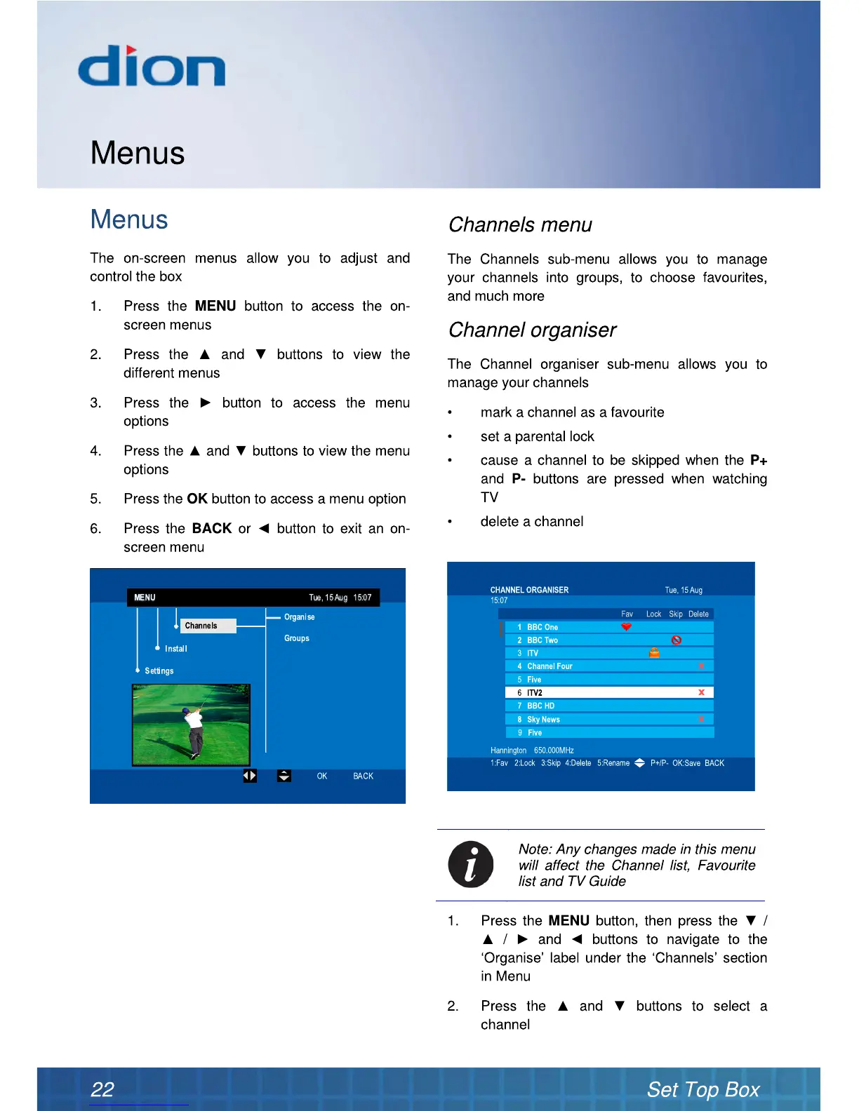 Dion DTR250SS10 - Menus; Menus overview; Channels menu; Channel organiser
