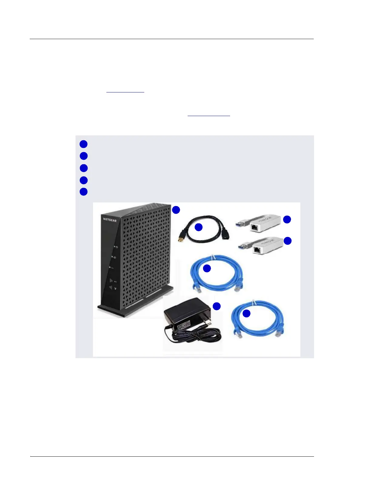 USB-to-Ethernet adapters, one of the two Ethernet cables, and the USB cable.