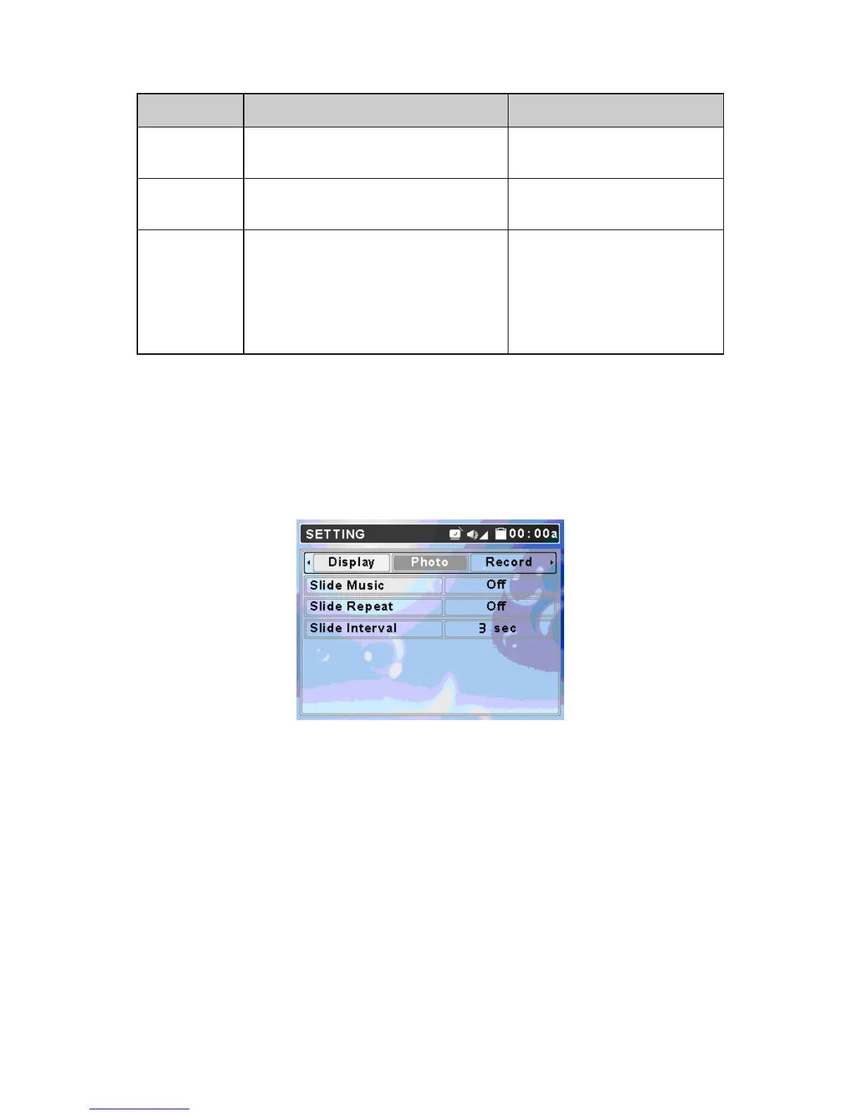 Repeat, and Slide Interval. Refer to the table below for the settings avail-