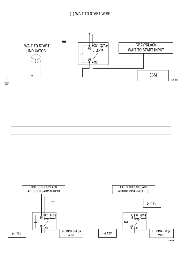 of the vehicle's factory anti-theft device. Use a relay to send a (-) or (+) pulse to the disarm wire as shown