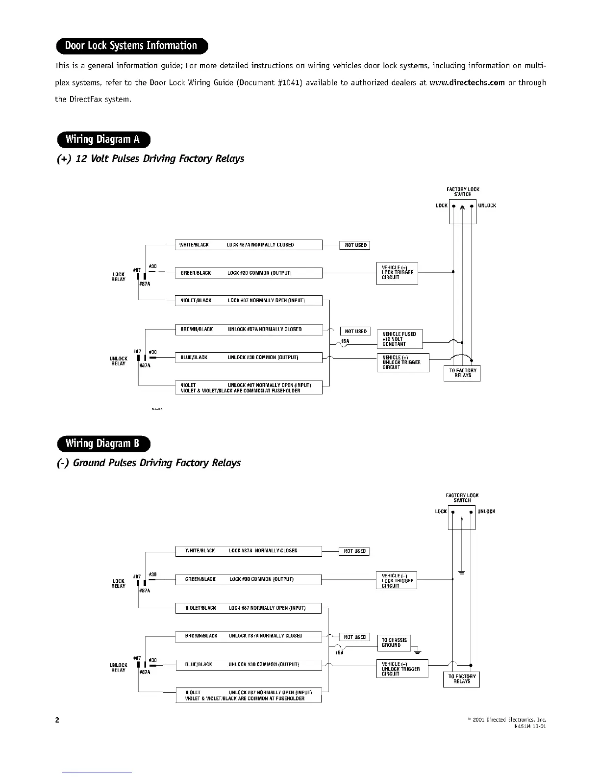 Directed 451m - Door Lock System Information; Wiring Diagram a - 12 Volts Pulses Driving Factory Relays; Wiring Diagram B - Ground Pulses Driving Factory Relays