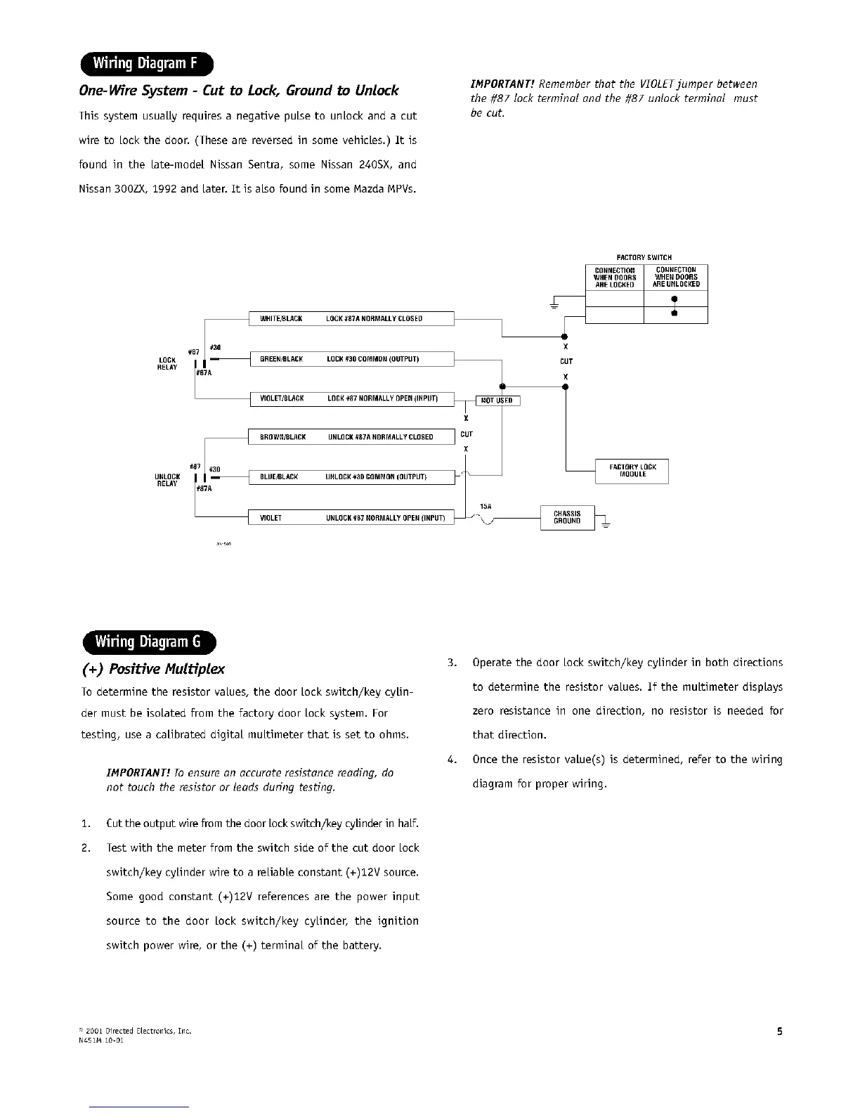 Directed 451m - Wiring Diagram F - One-Wire System - Cut to Lock, Ground to Unlock; Wiring Diagram G - Positive Multiplex